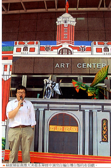 台南應用科技大學藝術中心門前,矗立著高三公尺,寬七公尺的總統府建築!別大驚小怪,它只是一座布袋戲的戲棚。而這個傑作正出自該校美術系應屆畢業生蘇俊穎的創意,他運用其慧心巧手,彩繪此一仿製總統府的建築作為布袋戲戲棚,14日上午在該校美術系101級畢業展中亮相演出,讓人讚嘆連連。 蘇俊穎國、高中時都就讀美術科,很自然的上大學也選讀美術系,而從小時後起,他就對布袋戲情有獨鍾,只因為,很是疼他的阿嬤一直以史艷文為偶像,因此常常向他說起史艷文的故事,加上家住廟口,常有機會看到布袋戲演出,耳濡目染,他就此愛上了布袋戲,年紀漸大之後,他開始買來布袋戲大師蘇俊雄的演出CD,邊看邊學他的操作布偶技巧與講話口白。 進入台南應大美術系後,蘇俊穎更利用課餘時間成立布袋戲社團,將原來的布袋戲迷研究社提升為掌中傳藝社,結合了10於位同學推廣之外,並請來西港清華閣掌中戲團師傅擔任社團指導老師,傳授社員布袋戲演出技巧。 有機會親炙大師風采,加上長時間來切磋琢磨,蘇俊穎布袋戲的演藝日益精進,於是開始有人請他前往演出,他曾受邀在善化慶安宮醮典、永康鹽行禹帝宮、社區活動中心落成謝土大典公演,不僅讓少年人大開眼界,也讓老布袋戲迷眼睛一亮。從此,蘇俊穎漸受矚目,包刮三立電視、地方有線電視台、遠見雜誌等都曾前往採訪報導。 蘇俊穎演出於不同於傳統的布袋戲,他不僅讓自編劇本,還運用了美術系課程中學到的技巧,以及創意的激發,開創了許多有趣的布袋戲道具與戲偶,也運用雕塑課與複合媒材所學的手法,用紙包覆保麗龍,補土後以砂紙磨光再進行彩繪,製作出許多突破傳統戲偶的作品,包刮台版阿凡達、Q版媽祖、千里眼、順風耳、孫悟空、沙悟淨、豬八戒、怪獸等約20件,相當有趣。