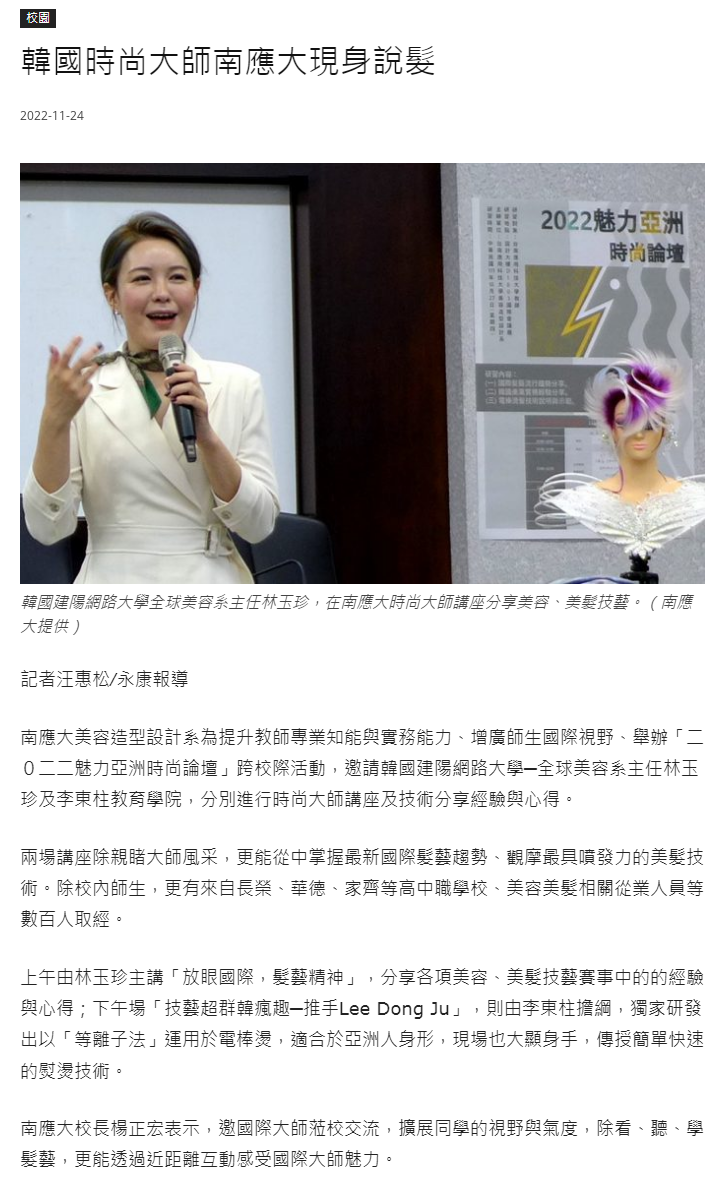 南應大美容造型設計系為提升教師專業知能與實務能力、增廣師生國際視野、舉辦「二0二二魅力亞洲時尚論壇」跨校際活動,邀請韓國建陽網路大學─全球美容系主任林玉珍及李東柱教育學院,分別進行時尚大師講座及技術分享經驗與心得。