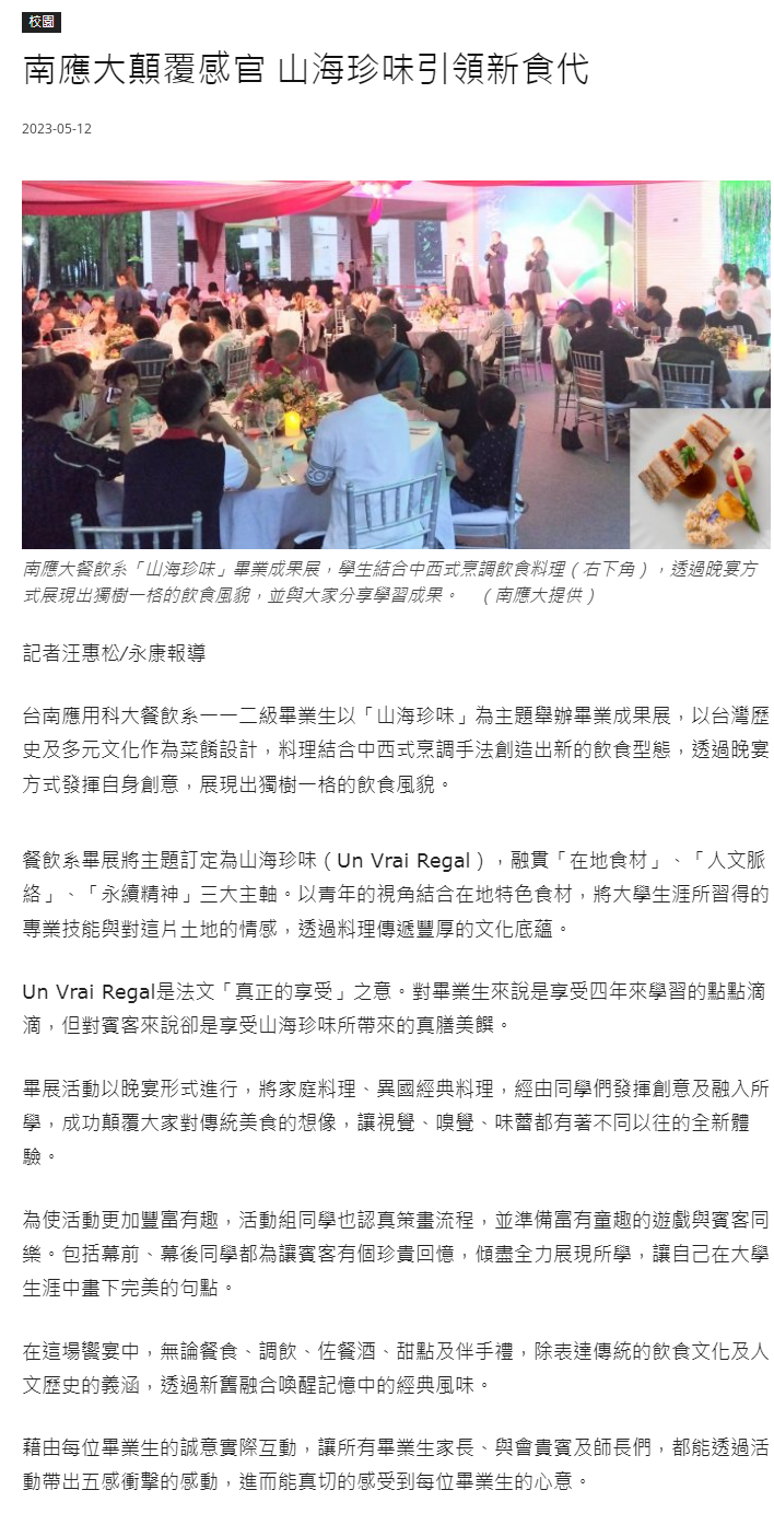 台南應用科大餐飲系一一二級畢業生以「山海珍味」為主題舉辦畢業成果展,以台灣歷史及多元文化作為菜餚設計,料理結合中西式烹調手法創造出新的飲食型態,透過晚宴方式發揮自身創意,展現出獨樹一格的飲食風貌。