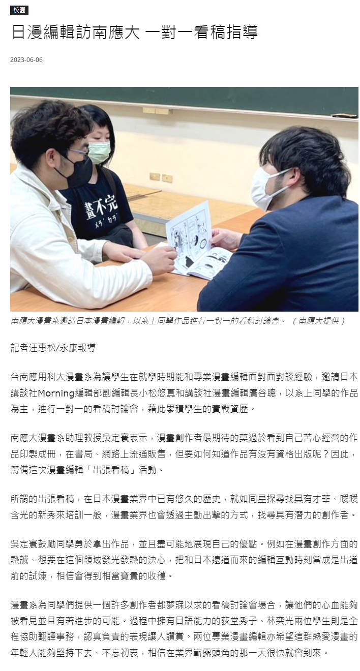 台南應用科大漫畫系為讓學生在就學時期能和專業漫畫編輯面對面對談經驗,邀請日本講談社Morning編輯部副編輯長小松悠真和講談社漫畫編輯廣谷聰,以系上同學的作品為主,進行一對一的看稿討論會,藉此累積學生的實戰資歷。