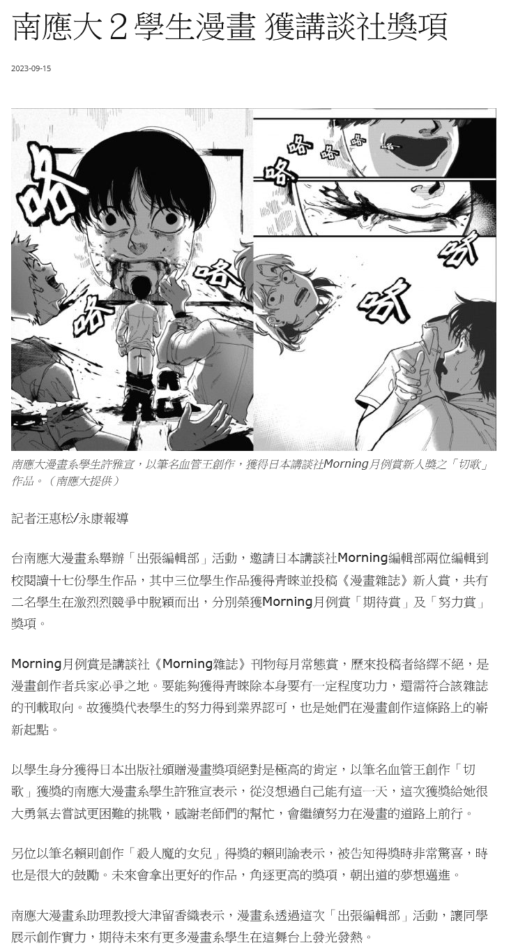 台南應大漫畫系舉辦「出張編輯部」活動,邀請日本講談社Morning編輯部兩位編輯到校閱讀十七份學生作品,其中三位學生作品獲得青睞並投稿《漫畫雜誌》新人賞,共有二名學生在激烈烈競爭中脫穎而出,分別榮獲Morning月例賞「期待賞」及「努力賞」獎項。