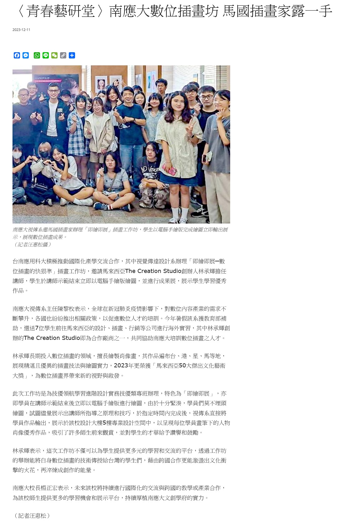 台南應用科大積極推動國際化產學交流合作,其中視覺傳達設計系辦理「即繪即展─數位插畫的快狠準」插畫工作坊,邀請馬來西亞The Creation Studio創辦人林承輝擔任講師,學生於講師示範結束立即以電腦手繪版繪圖,並進行成果展,展示學生學習優秀作品。
