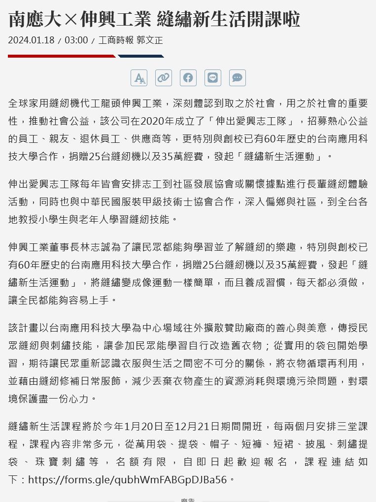 全球家用縫紉機代工龍頭伸興工業,深刻體認到取之於社會,用之於社會的重要性,推動社會公益,該公司在2020年成立了「伸出愛興志工隊」,招募熱心公益的員工、親友、退休員工、供應商等,更特別與創校已有60年歷史的台南應用科技大學合作,捐贈25台縫紉機以及35萬經費,發起「縫繡新生活運動」。