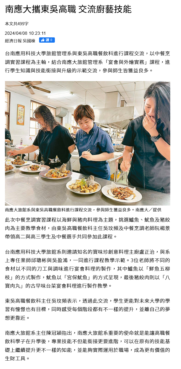 台南應用科技大學旅館管理系與東吳高職餐飲科進行課程交流,以中餐烹調實習課程為主軸,結合南應大旅館管理系「宴會與外燴實務」課程,進行學生知識與技能銜接與升級的示範交流,參與師生皆獲益良多。
