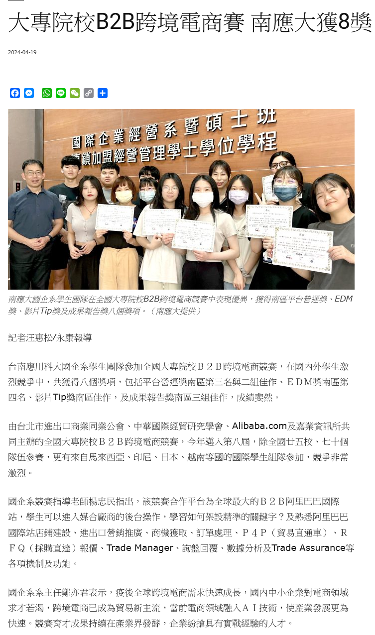 台南應用科大國企系學生團隊參加全國大專院校B2B跨境電商競賽,在國內外學生激烈競爭中,共獲得八個獎項,包括平台營運獎南區第三名與二組佳作、EDM獎南區第四名、影片Tip獎南區佳作,及成果報告獎南區三組佳作,成績斐然。