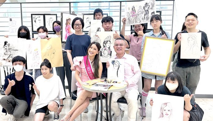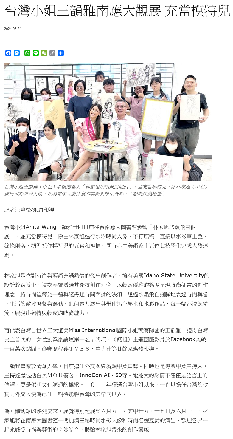 台灣小姐Anita Wang王韻雅廿四日前往台南應大圖書館參觀「林家旭法頌飛白個展」,並充當模特兒,除由林家旭進行水彩時尚人像,不打底稿,直接以水彩筆上色,線條俐落,精準抓住模特兒的五官和神情。同時亦由美術系十五位七技學生完成人體速寫。