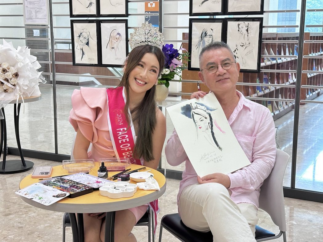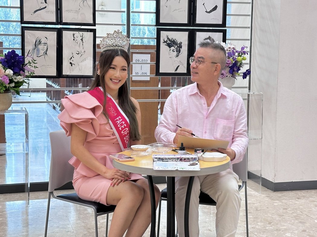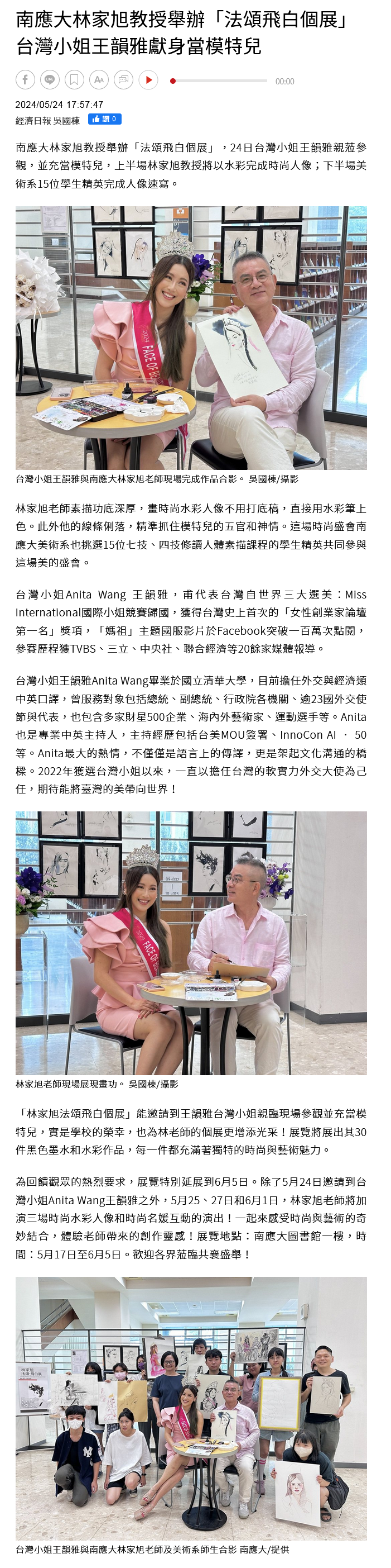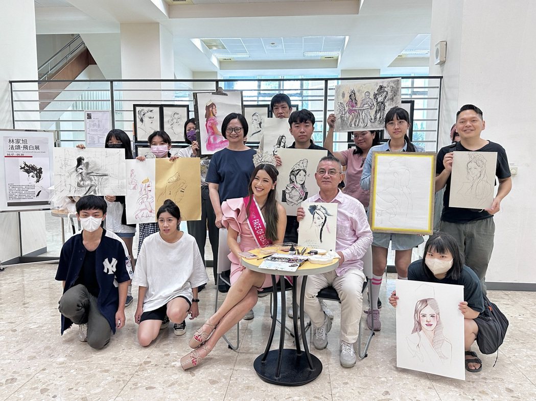 南應大林家旭教授舉辦「法頌飛白個展」,24日台灣小姐王韻雅親蒞參觀,並充當模特兒,上半場林家旭教授將以水彩完成時尚人像;下半場美術系15位學生精英完成人像速寫。