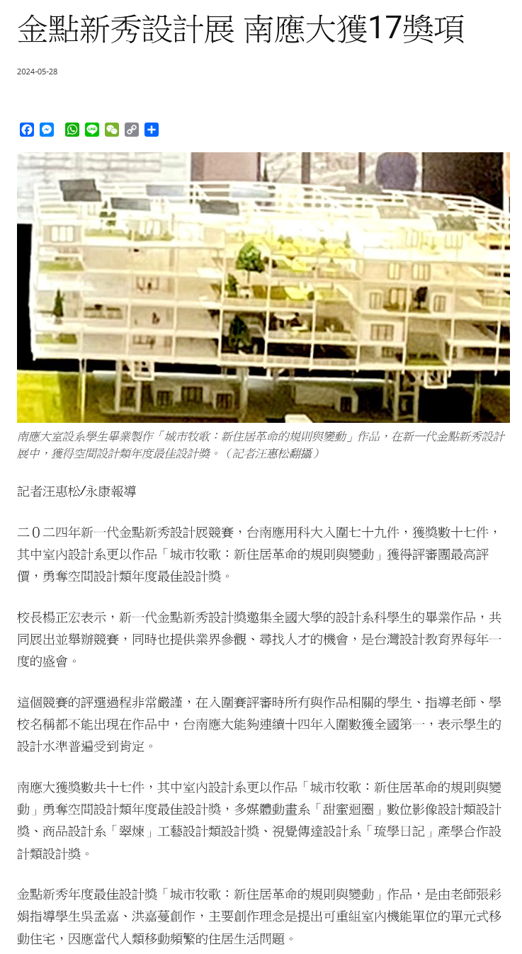 二0二四年新一代金點新秀設計展競賽,台南應用科大入圍七十九件,獲獎數十七件,其中室內設計系更以作品「城市牧歌:新住居革命的規則與變動」獲得評審團最高評價,勇奪空間設計類年度最佳設計獎。