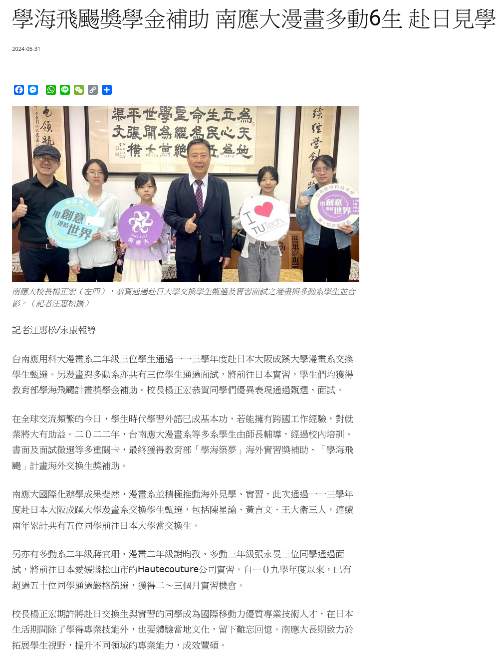 台南應用科大漫畫系二年級三位學生通過一一三學年度赴日本大阪成蹊大學漫畫系交換學生甄選。另漫畫與多動系亦共有三位學生通過面試,將前往日本實習,學生們均獲得教育部學海飛颺計畫獎學金補助。校長楊正宏恭賀同學們優異表現通過甄選、面試。