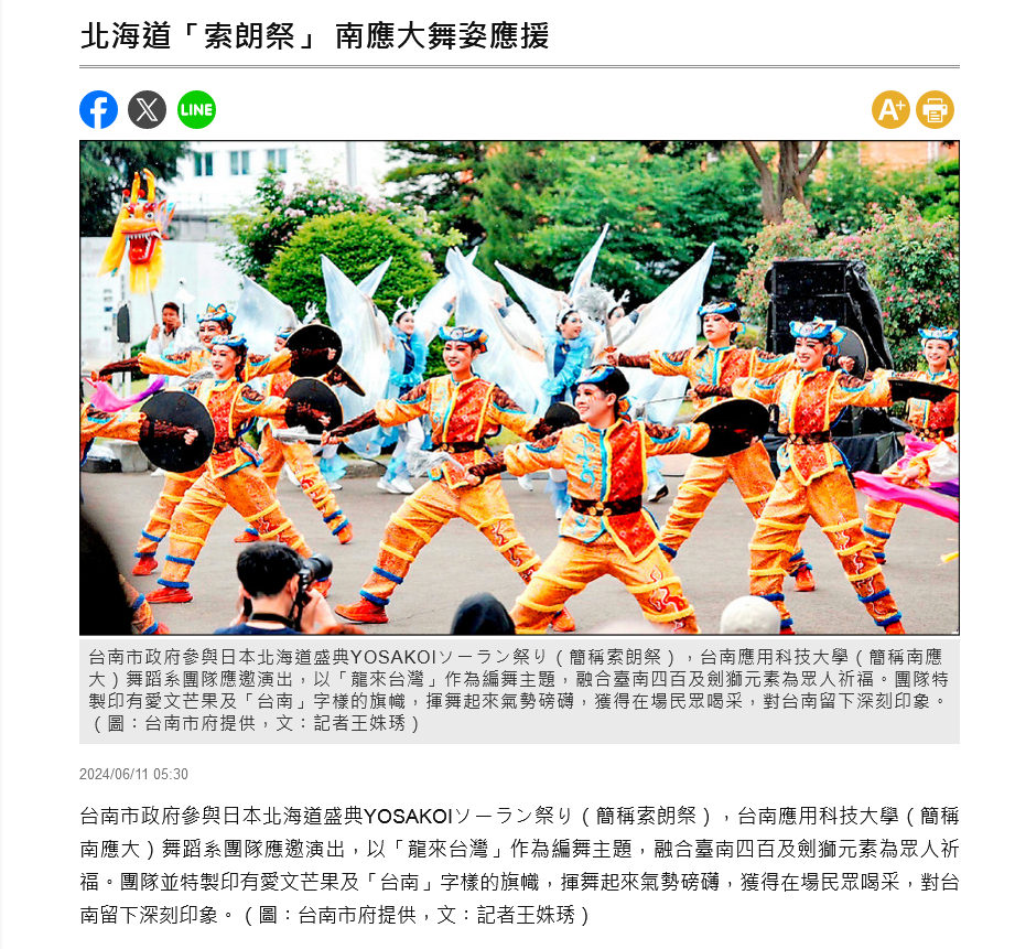 北海道「索朗祭」 南應大舞姿應援 【記者林曉雲報導】https://news.ltn.com.tw/news/life/paper/1650768 台南市政府參與日本北海道盛典YOSAKOIソーラン祭り(簡稱索朗祭),台南應用科技大學(簡稱南應大)舞蹈系團隊應邀演出,以「龍來台灣」作為編舞主題,融合臺南四百及劍獅元素為眾人祈福。團隊並特製印有愛文芒果及「台南」字樣的旗幟,揮舞起來氣勢磅礡,獲得在場民眾喝采,對台南留下深刻印象。