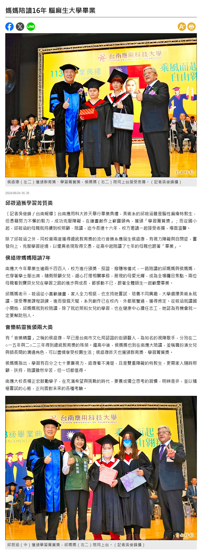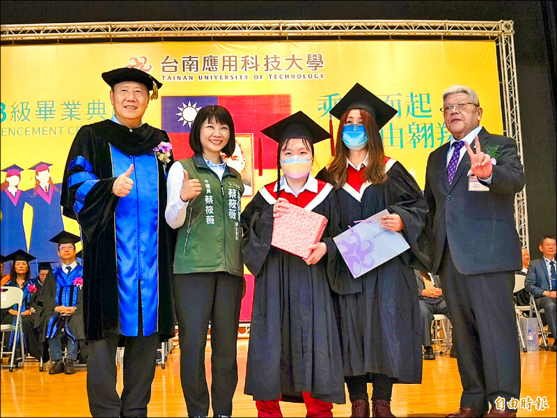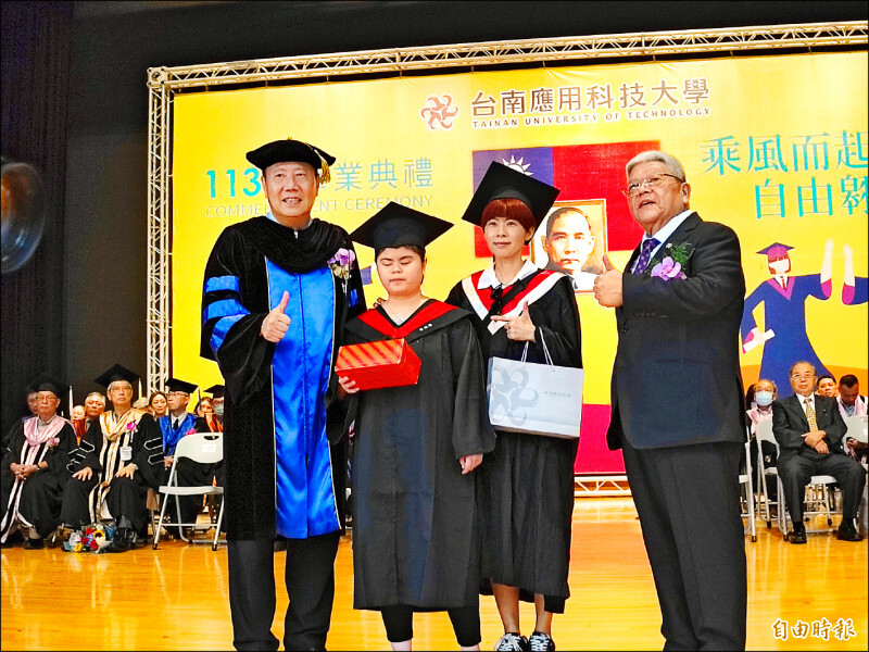 南應用科大昨天舉行畢業典禮,美術系的邱筱涵雖是腦性麻痺特教生,但憑藉努力不懈的毅力,成功克服障礙,在繪畫創作上嶄露頭角,獲頒「學習菁質獎」;而從國小起,邱筱涵的母親就持續到校照顧、陪讀,迄今長達十六年,校方邀請一起接受表揚,場面溫馨。