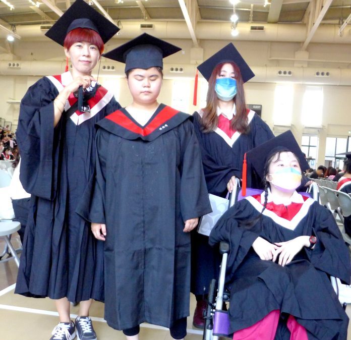 這兩位身障畢業生努力勤學,典禮中也與媽媽一起上台接受表揚,頒發群育、學習菁質獎,並感謝兩位媽媽四年來的陪伴與付出。
