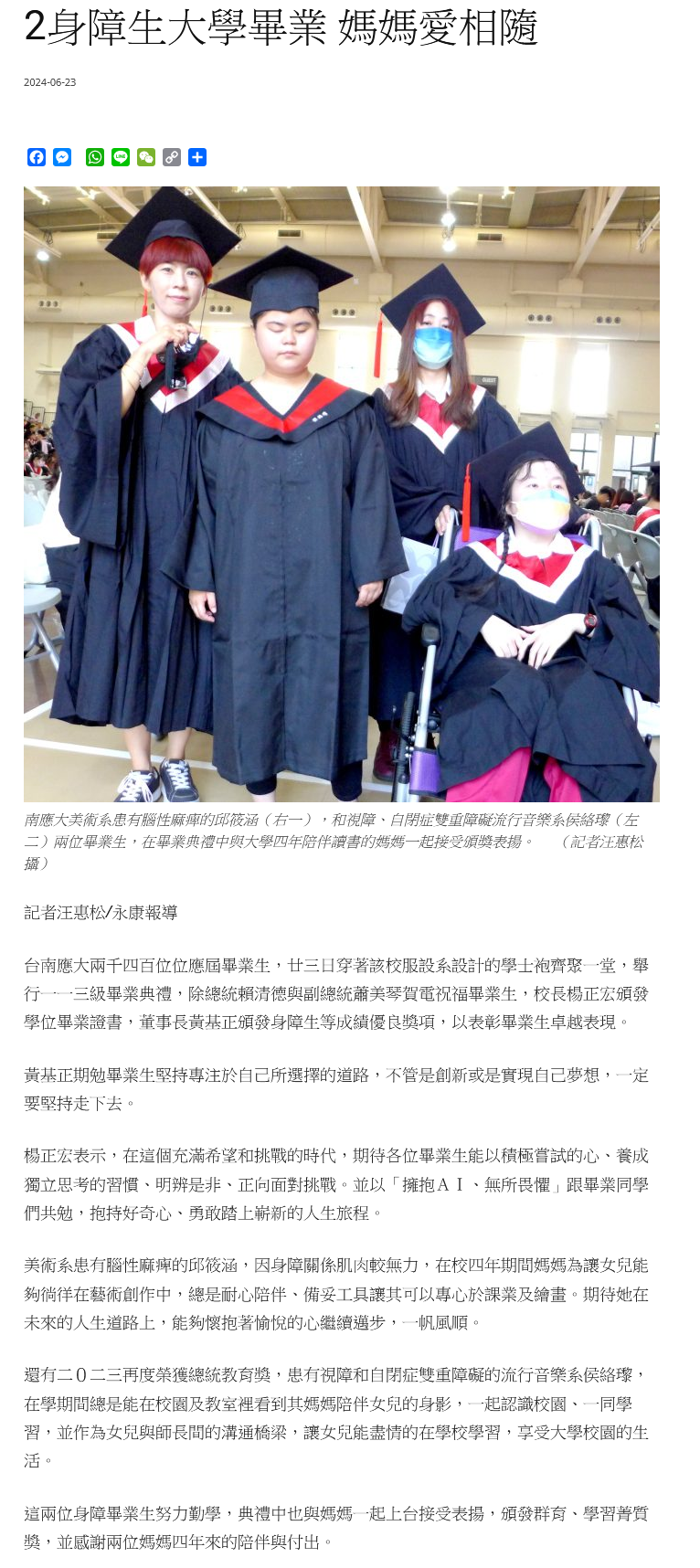 美術系患有腦性麻痺的邱筱涵,因身障關係肌肉較無力,在校四年期間媽媽為讓女兒能夠徜徉在藝術創作中,總是耐心陪伴、備妥工具讓其可以專心於課業及繪畫。期待她在未來的人生道路上,能夠懷抱著愉悅的心繼續邁步,一帆風順。