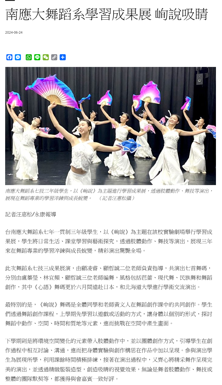 台南應大舞蹈系七年一貫制三年級學生,以《峋說》為主題在該校實驗劇場舉行學習成果展,學生將日常生活、課堂學習與藝術探究,透過肢體動作、舞技等演出,展現三年來在舞蹈專業的學習淬鍊與成長蛻變,精彩演出驚艷全場。