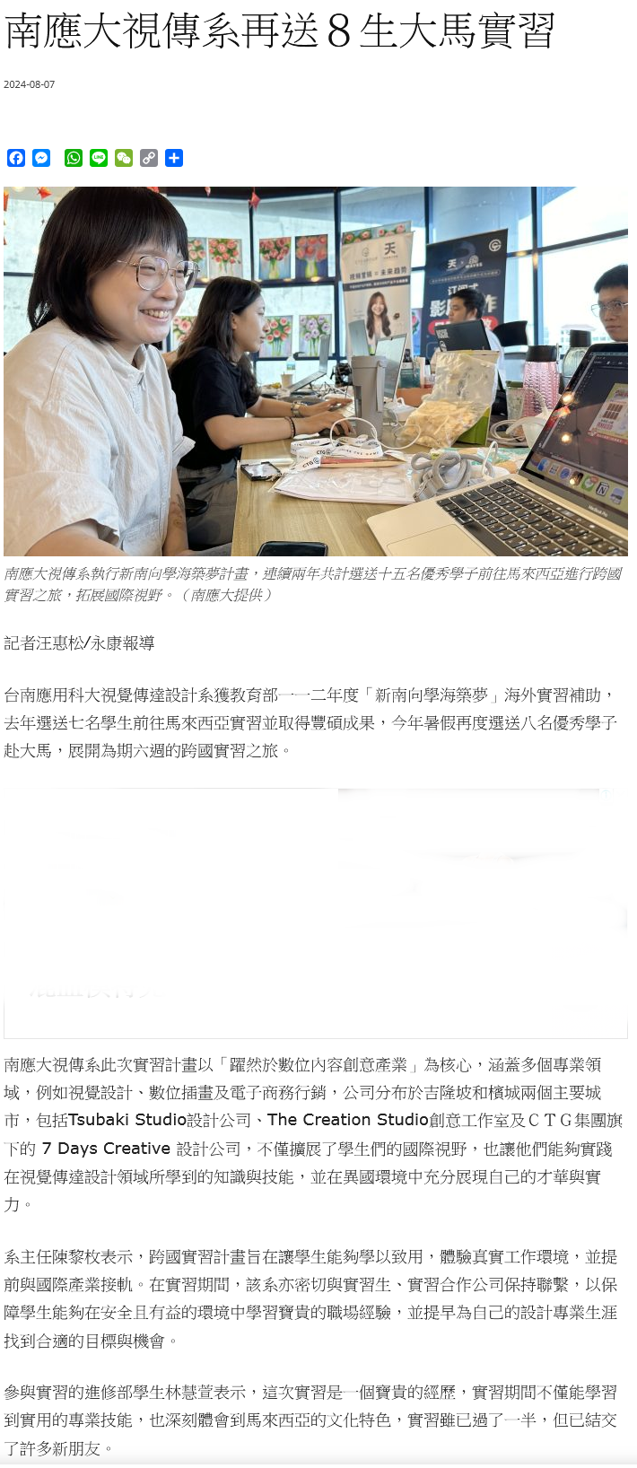 南應大視傳系此次實習計畫以「躍然於數位內容創意產業」為核心,涵蓋多個專業領域,例如視覺設計、數位插畫及電子商務行銷,公司分布於吉隆坡和檳城兩個主要城市,包括Tsubaki Studio設計公司、The Creation Studio創意工作室及CTG集團旗下的 7 Days Creative 設計公司,不僅擴展了學生們的國際視野,也讓他們能夠實踐在視覺傳達設計領域所學到的知識與技能,並在異國環境中充分展現自己的才華與實力。
