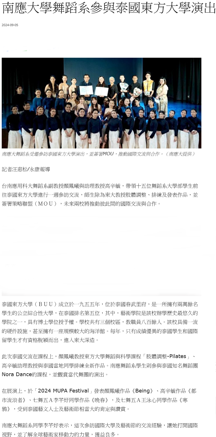 台南應用科大舞蹈系副教授顏鳳曦與助理教授高辛毓,帶領十五位舞蹈系大學部學生前往泰國東方大學進行一週參訪交流,師生除為東大教授肢體調整、排練及發表作品,並簽署策略聯盟(MOU),未來兩校將推動彼此間的國際交流與合作。