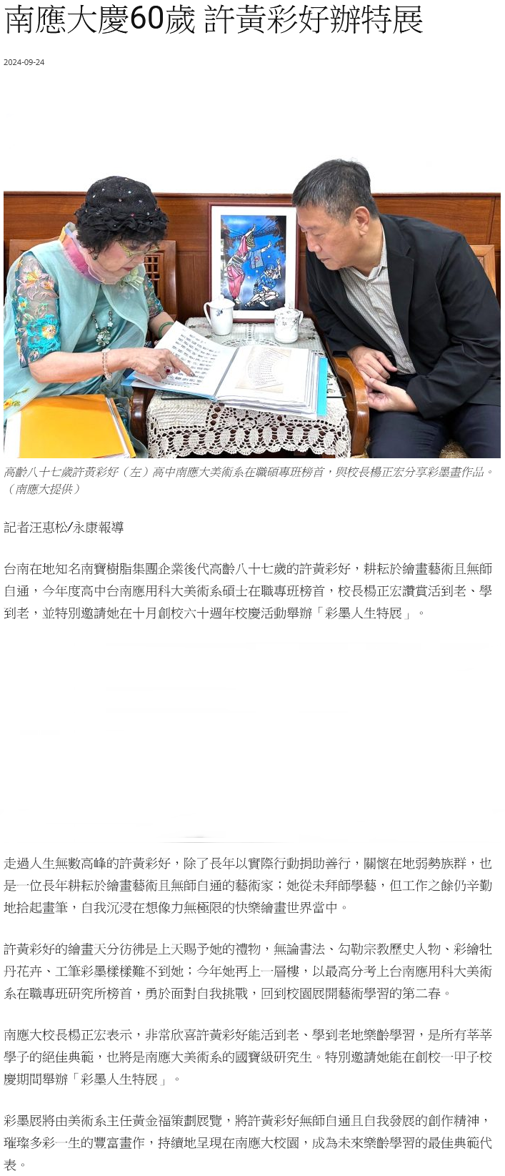 台南在地知名南寶樹脂集團企業後代高齡八十七歲的許黃彩好,耕耘於繪畫藝術且無師自通,今年度高中台南應用科大美術系碩士在職專班榜首,校長楊正宏讚賞活到老、學到老,並特別邀請她在十月創校六十週年校慶活動舉辦「彩墨人生特展」。