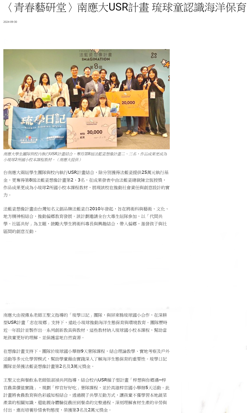 台南應大兩組學生團隊與校內執行USR計畫結合,除分別獲得法藍瓷提供25萬元執行基金,更奪得第8屆法藍瓷想像計畫第2、3名,在成果發表中由法藍瓷總裁陳立恆授獎,作品成果更成為小琉球2所國小校本課程教材,展現該校在推動社會責任與創意設計的實力。