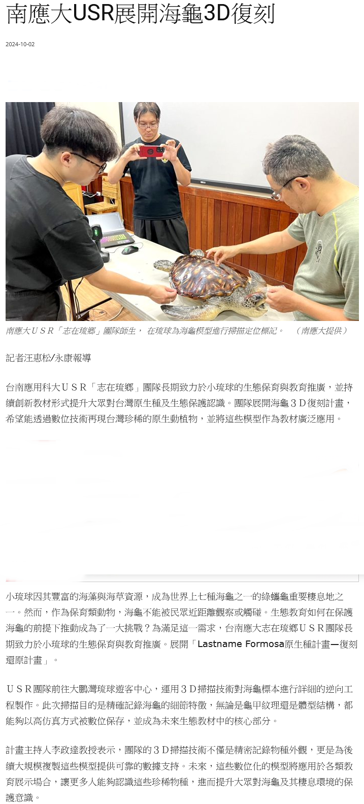團隊展開海龜3D復刻計畫,希望能透過數位技術再現台灣珍稀的原生動植物,並將這些模型作為教材廣泛應用。