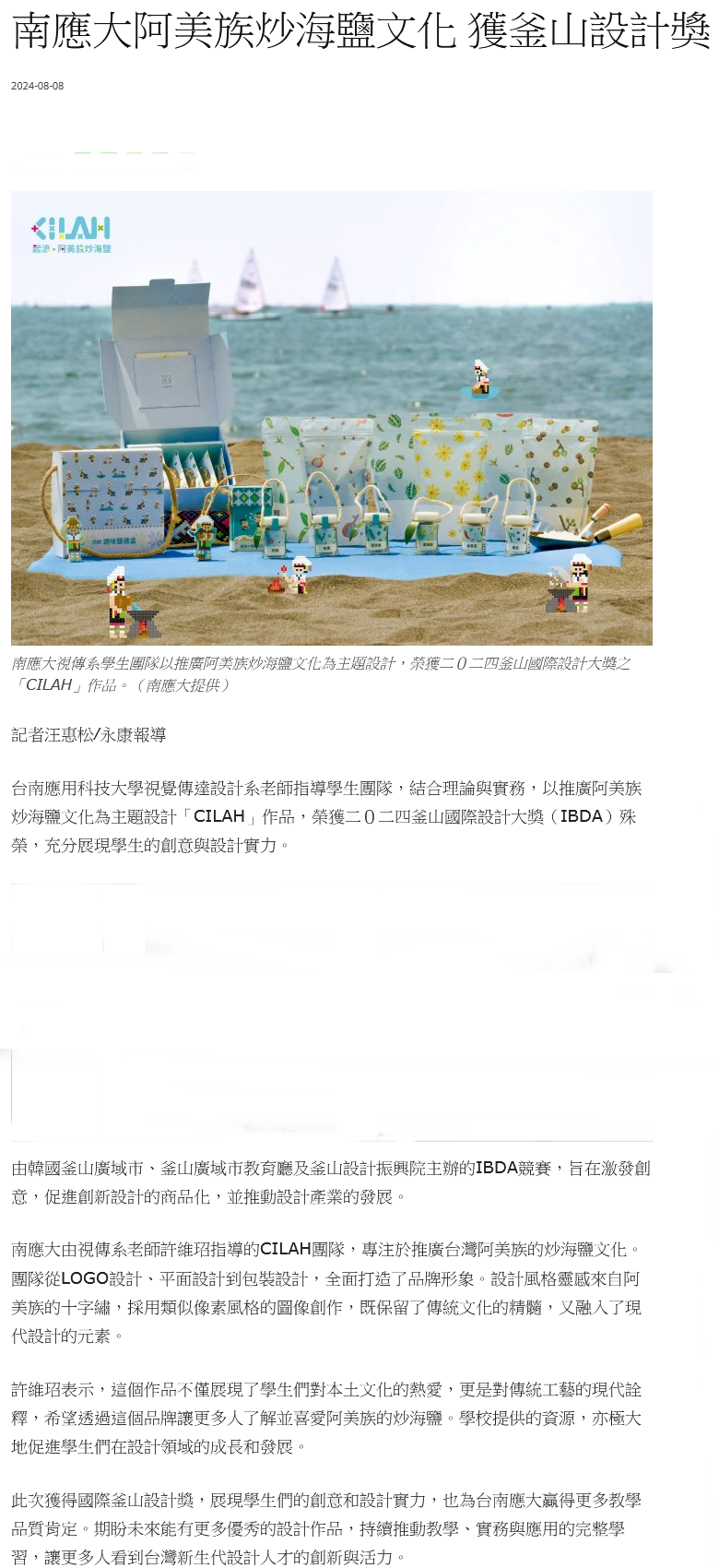 台南應用科技大學視覺傳達設計系老師指導學生團隊,結合理論與實務,以推廣阿美族炒海鹽文化為主題設計「CILAH」作品,榮獲二0二四釜山國際設計大獎(IBDA)殊榮,充分展現學生的創意與設計實力。