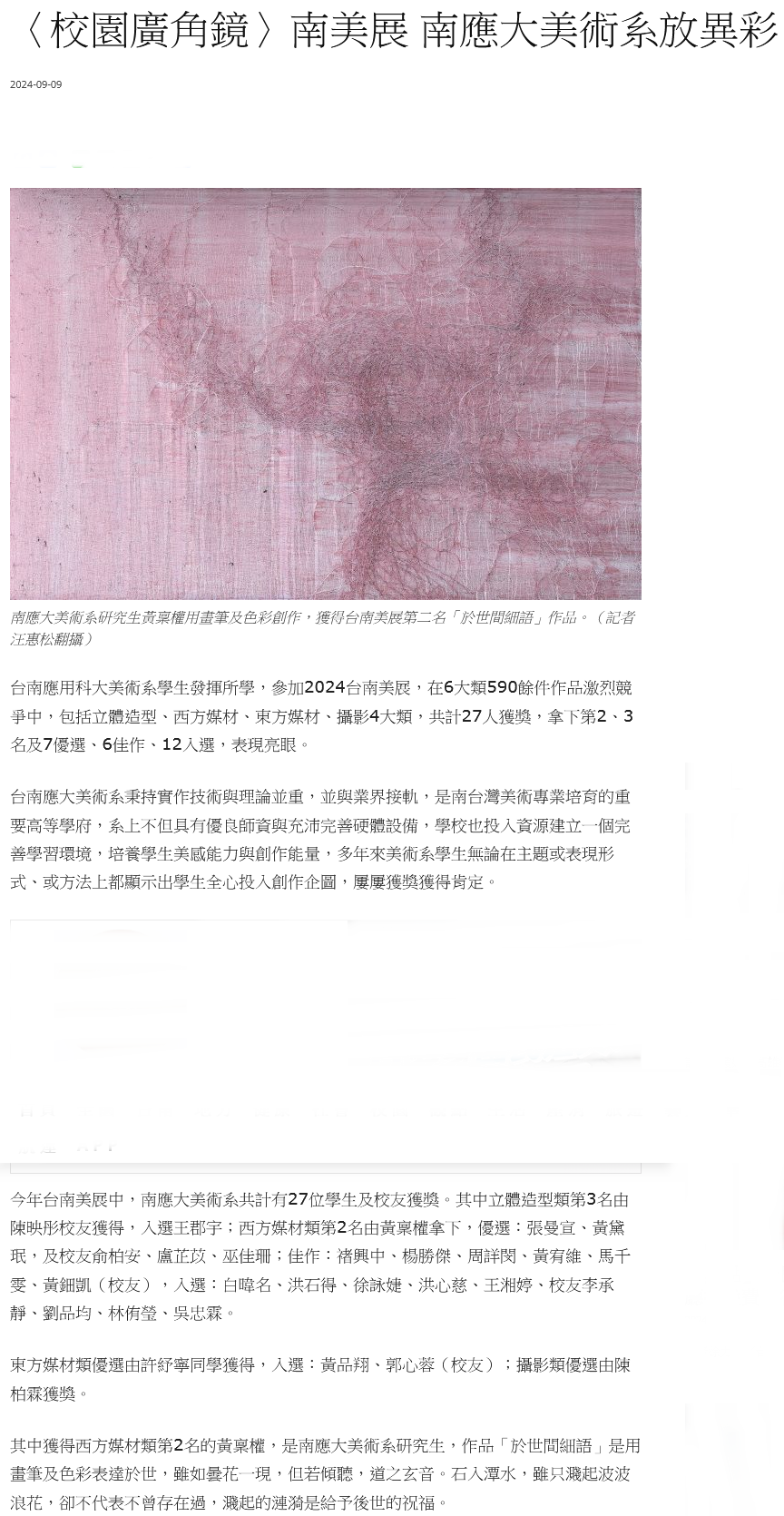 台南應用科大美術系學生發揮所學,參加2024台南美展,在6大類590餘件作品激烈競爭中,包括立體造型、西方媒材、東方媒材、攝影4大類,共計27人獲獎,拿下第2、3名及7優選、6佳作、12入選,表現亮眼。