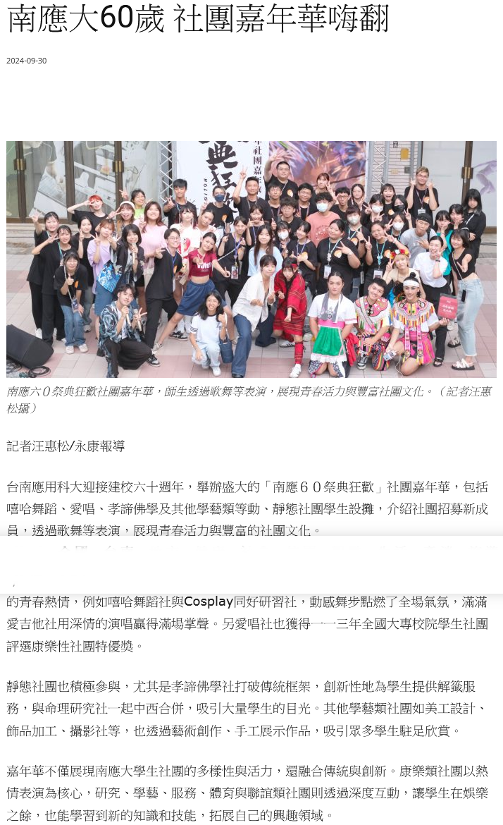 台南應用科大迎接建校六十週年,舉辦盛大的「南應60祭典狂歡」社團嘉年華,包括嘻哈舞蹈、愛唱、孝諦佛學及其他學藝類等動、靜態社團學生設攤,介紹社團招募新成員,透過歌舞等表演,展現青春活力與豐富的社團文化。