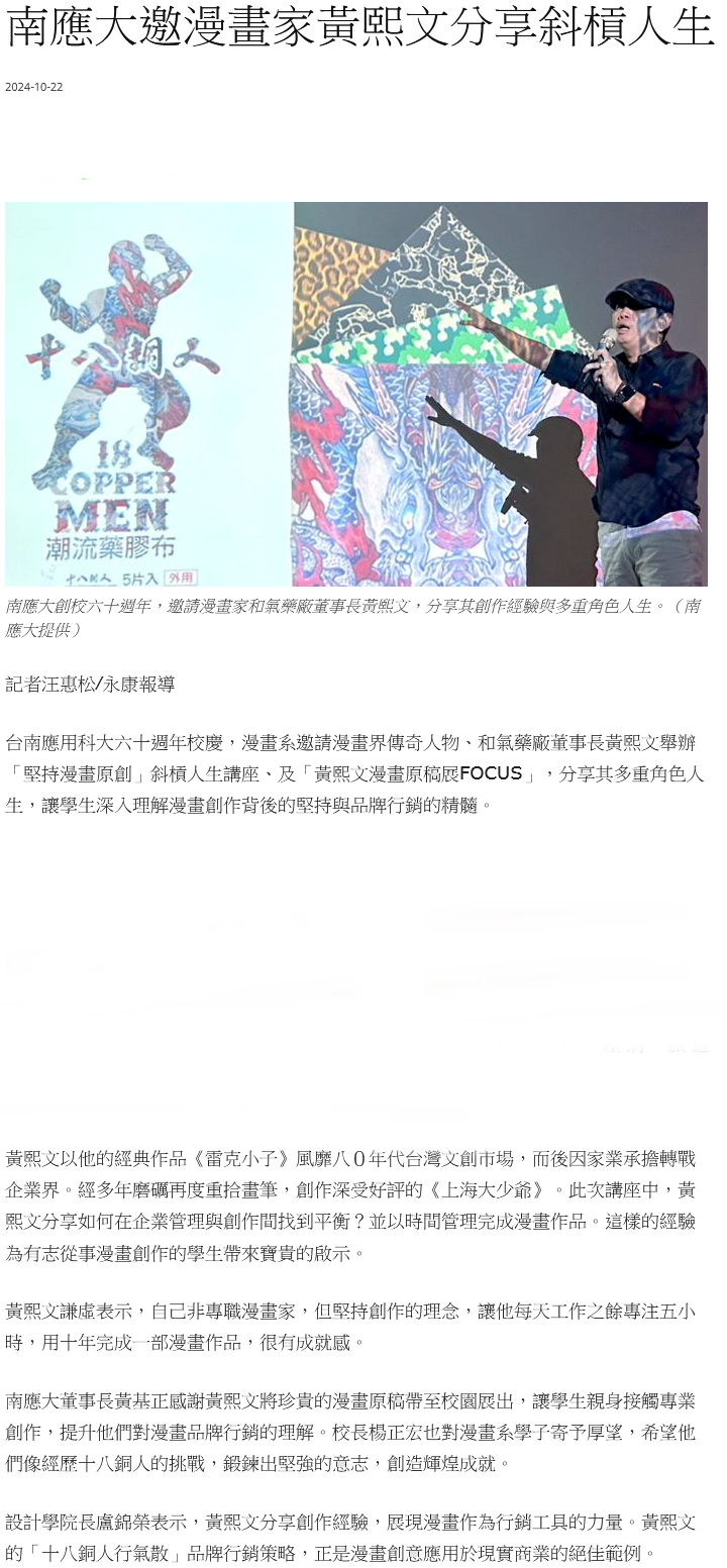 台南應用科大六十週年校慶,漫畫系邀請漫畫界傳奇人物、和氣藥廠董事長黃熙文舉辦「堅持漫畫原創」斜槓人生講座、及「黃熙文漫畫原稿展FOCUS」,分享其多重角色人生,讓學生深入理解漫畫創作背後的堅持與品牌行銷的精髓。