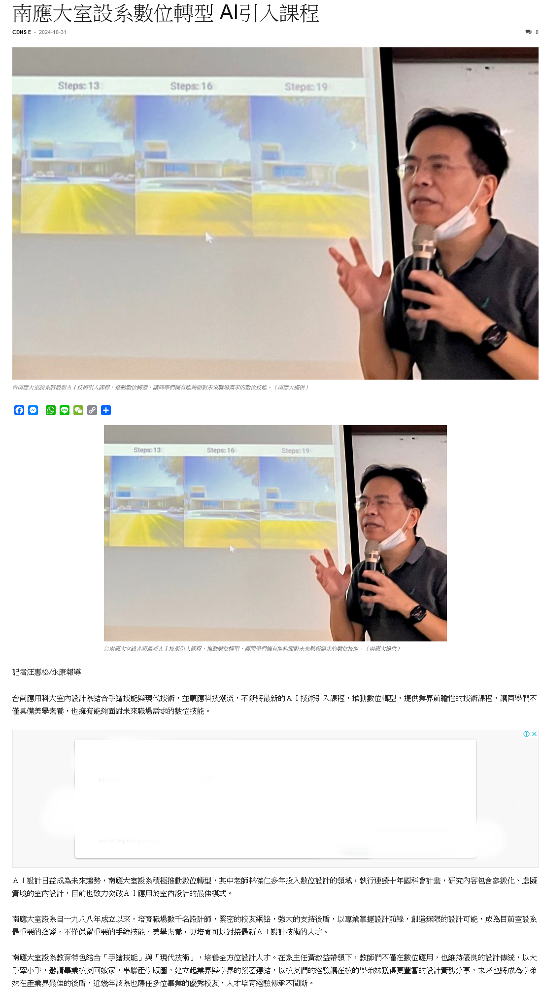 AI設計日益成為未來趨勢,南應大室設系積極推動數位轉型,其中老師林傑仁多年投入數位設計的領域,執行連續十年國科會計畫,研究內容包含參數化、虛擬實境的室內設計,目前也致力突破AI應用於室內設計的最佳模式。