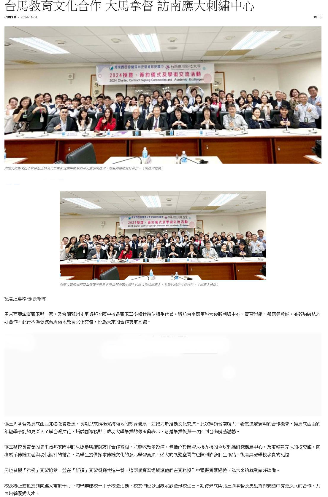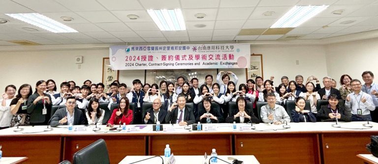 馬來西亞拿督張玉興一家,及雪蘭莪州史里肯邦安國中校長張玉華率領廿餘位師生代表,造訪台南應用科大參觀刺繡中心、實習旅館、餐廳等設施,並簽約締結友好合作,此行不僅促進台馬兩地教育文化交流,也為未來的合作奠定基礎。