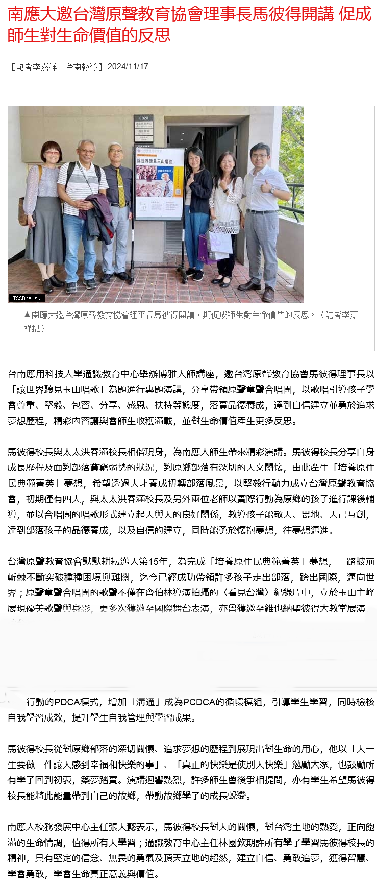 台南應用科技大學通識教育中心舉辦博雅大師講座,邀台灣原聲教育協會馬彼得理事長以「讓世界聽見玉山唱歌」為題進行專題演講,分享帶領原聲童聲合唱團,以歌唱引導孩子學會尊重、堅毅、包容、分享、感恩、扶持等態度,落實品德養成,達到自信建立並勇於追求夢想歷程,精彩內容讓與會師生收穫滿載,並對生命價值產生更多反思。