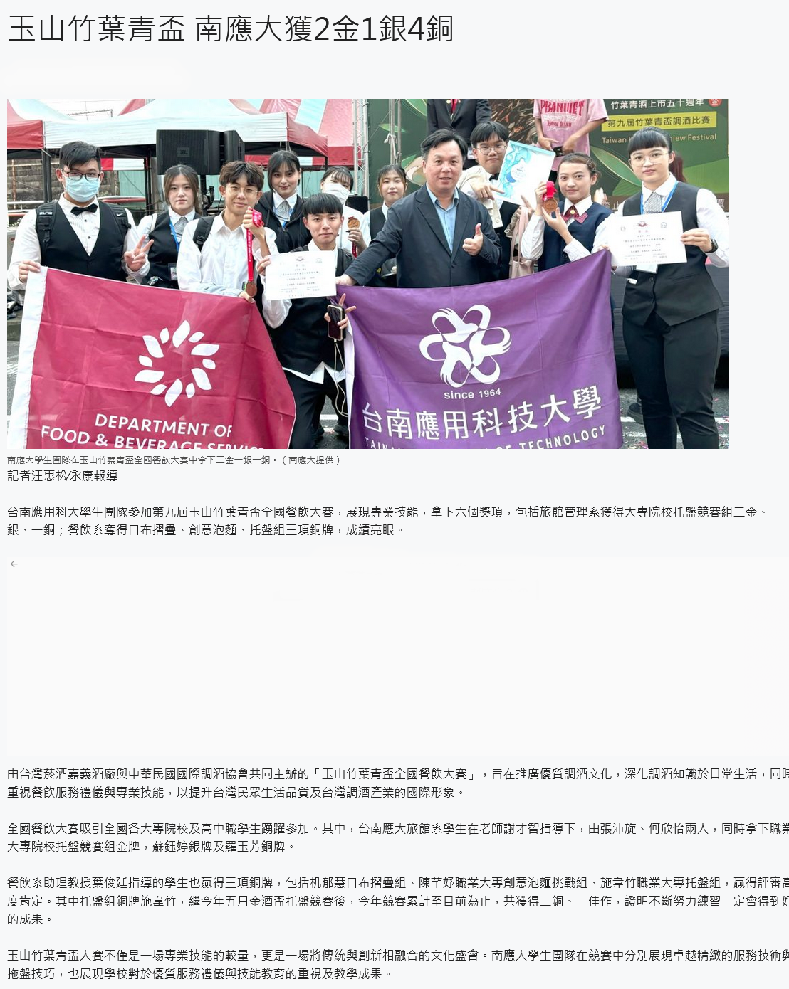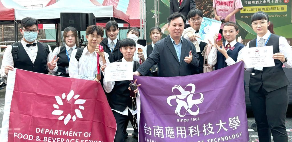 台南應用科大學生團隊參加第九屆玉山竹葉青盃全國餐飲大賽,展現專業技能,拿下六個獎項,包括旅館管理系獲得大專院校托盤競賽組二金、一銀、一銅;餐飲系奪得口布摺疊、創意泡麵、托盤組三項銅牌,成績亮眼。