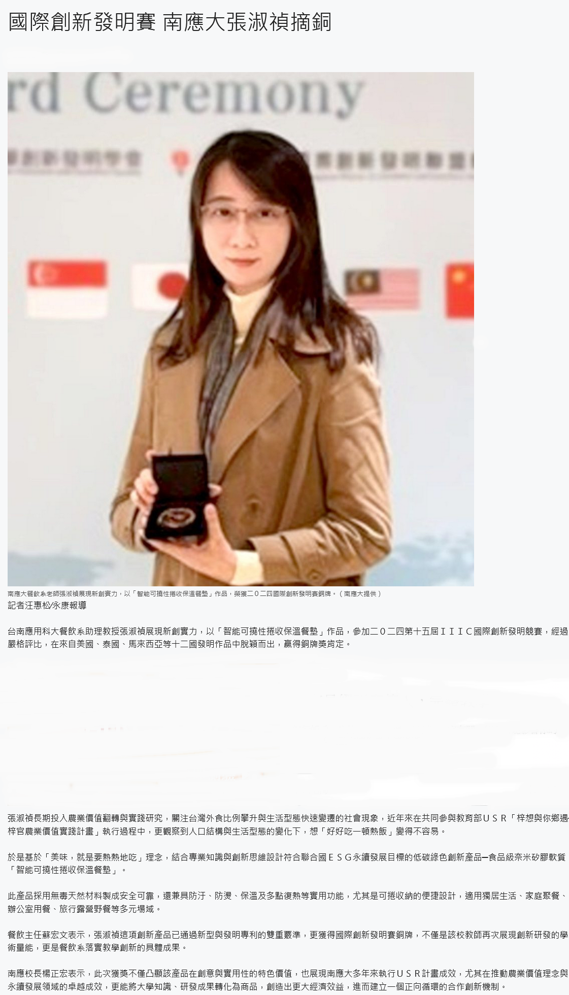 台南應用科大餐飲系助理教授張淑禎展現新創實力,以「智能可撓性捲收保溫餐墊」作品,參加二0二四第十五屆IIIC國際創新發明競賽,經過嚴格評比,在來自美國、泰國、馬來西亞等十二國發明作品中脫穎而出,贏得銅牌獎肯定。
