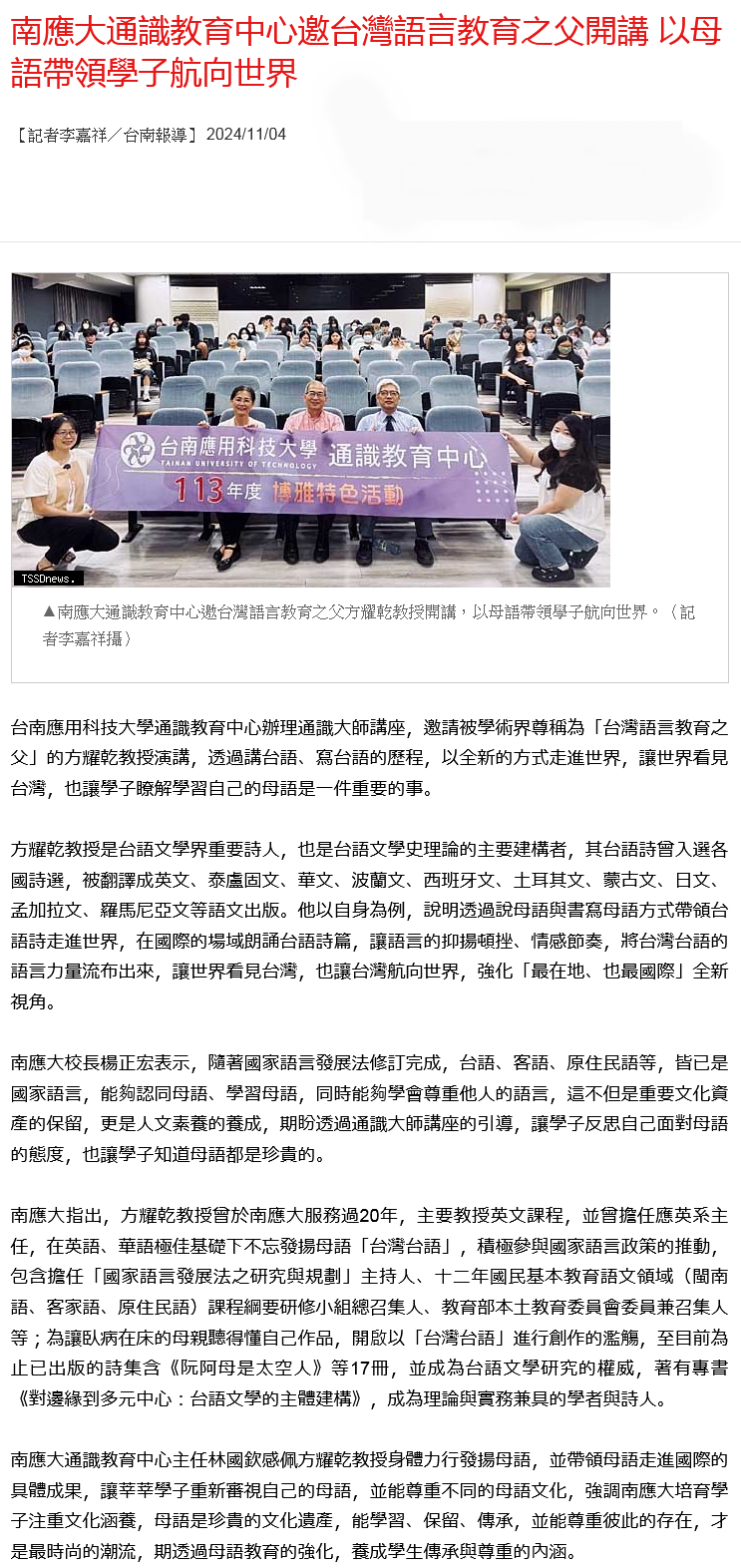 台南應用科技大學通識教育中心辦理通識大師講座,邀請被學術界尊稱為「台灣語言教育之父」的方耀乾教授演講,透過講台語、寫台語的歷程,以全新的方式走進世界,讓世界看見台灣,也讓學子瞭解學習自己的母語是一件重要的事。