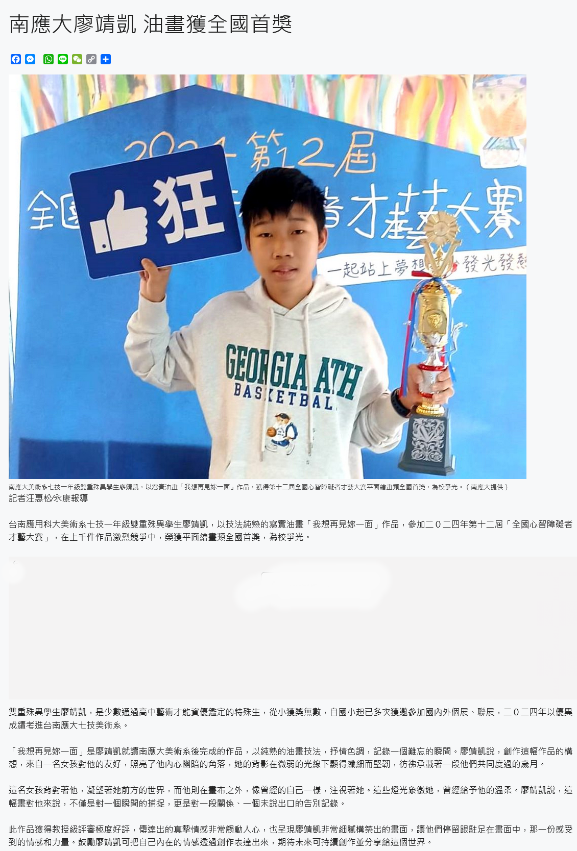 雙重殊異學生廖靖凱,是少數通過高中藝術才能資優鑑定的特殊生,從小獲獎無數,自國小起已多次獲邀參加國內外個展、聯展,二0二四年以優異成績考進台南應大七技美術系。