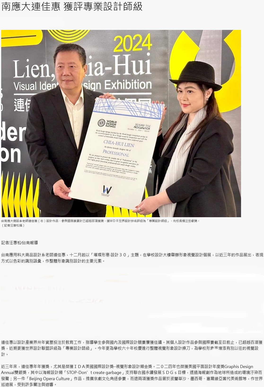近三年來,連佳惠年年獲獎,尤其是榮獲IDA美國國際設計獎–視覺形象設計類金獎。二0二四年也榮獲美國平面設計年度獎Graphis Design Annual雙銀獎,其中以海報設計類「STOP-Don’t create garbage」支持聯合國永續發展SDGs目標,透過海報創作為地球所造成的環境汙染而發聲;另一件「Beijing Opera Culture」作品,推廣京劇文化角逐參賽,而這兩項獲獎作品曾於波蘭華沙、墨西哥、塞爾維亞當代美術館等,作世界巡迴展,受到許多關注與迴響。
