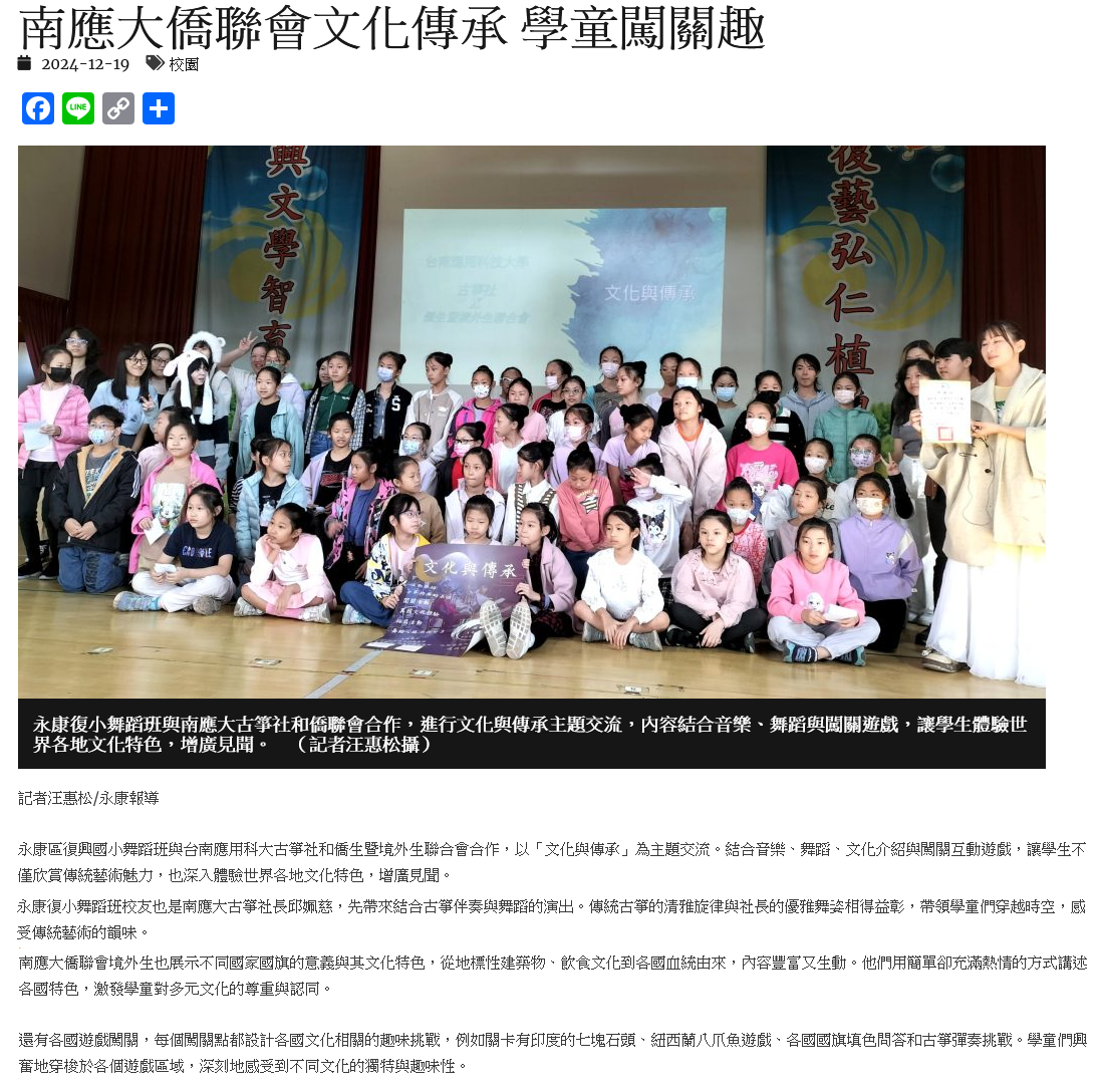 永康區復興國小舞蹈班與台南應用科大古箏社和僑生暨境外生聯合會合作,以「文化與傳承」為主題交流。結合音樂、舞蹈、文化介紹與闖關互動遊戲,讓學生不僅欣賞傳統藝術魅力,也深入體驗世界各地文化特色,增廣見聞。