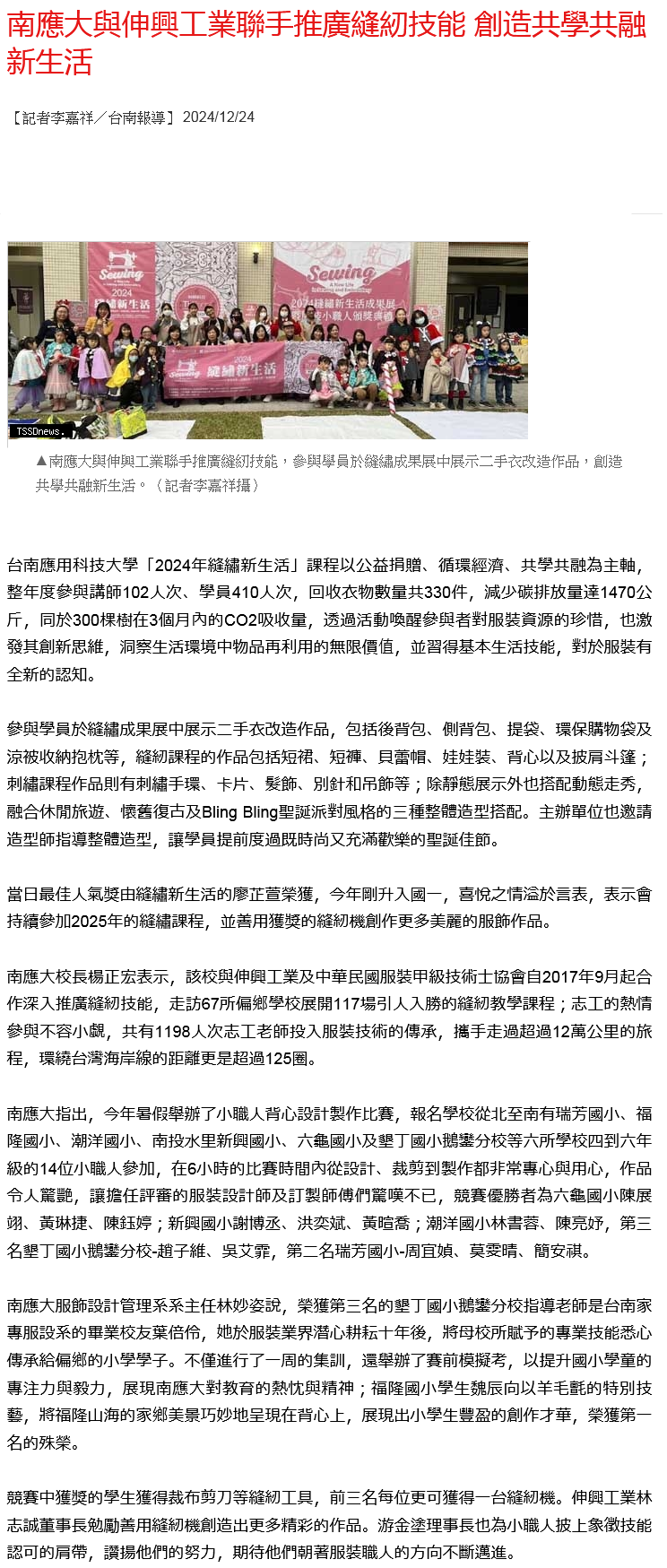 台南應用科技大學「2024年縫繡新生活」課程以公益捐贈、循環經濟、共學共融為主軸,整年度參與講師102人次、學員410人次,回收衣物數量共330件,減少碳排放量達1470公斤,同於300棵樹在3個月內的CO2吸收量,透過活動喚醒參與者對服裝資源的珍惜,也激發其創新思維,洞察生活環境中物品再利用的無限價值,並習得基本生活技能,對於服裝有全新的認知。