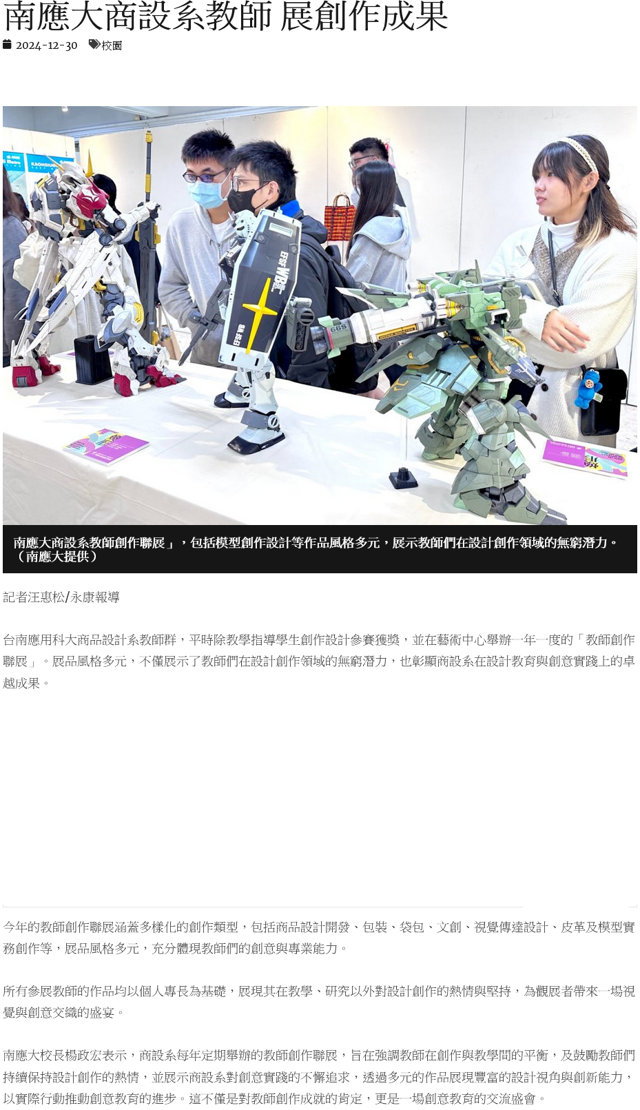 台南應用科大商品設計系教師群,平時除教學指導學生創作設計參賽獲獎,並在藝術中心舉辦一年一度的「教師創作聯展」。展品風格多元,不僅展示了教師們在設計創作領域的無窮潛力,也彰顯商設系在設計教育與創意實踐上的卓越成果。