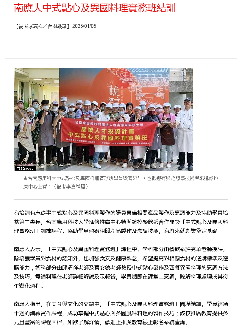 南應大指出,在美食與文化的交融中,「中式點心及異國料理實務班」圓滿結訓,學員經過十週的訓練實作課程,成功掌握中式點心與多國風味料理的製作技巧;該校推廣教育提供多元且豐富的課程內容,如欲了解詳情,歡迎上推廣教育線上報名系統查詢。