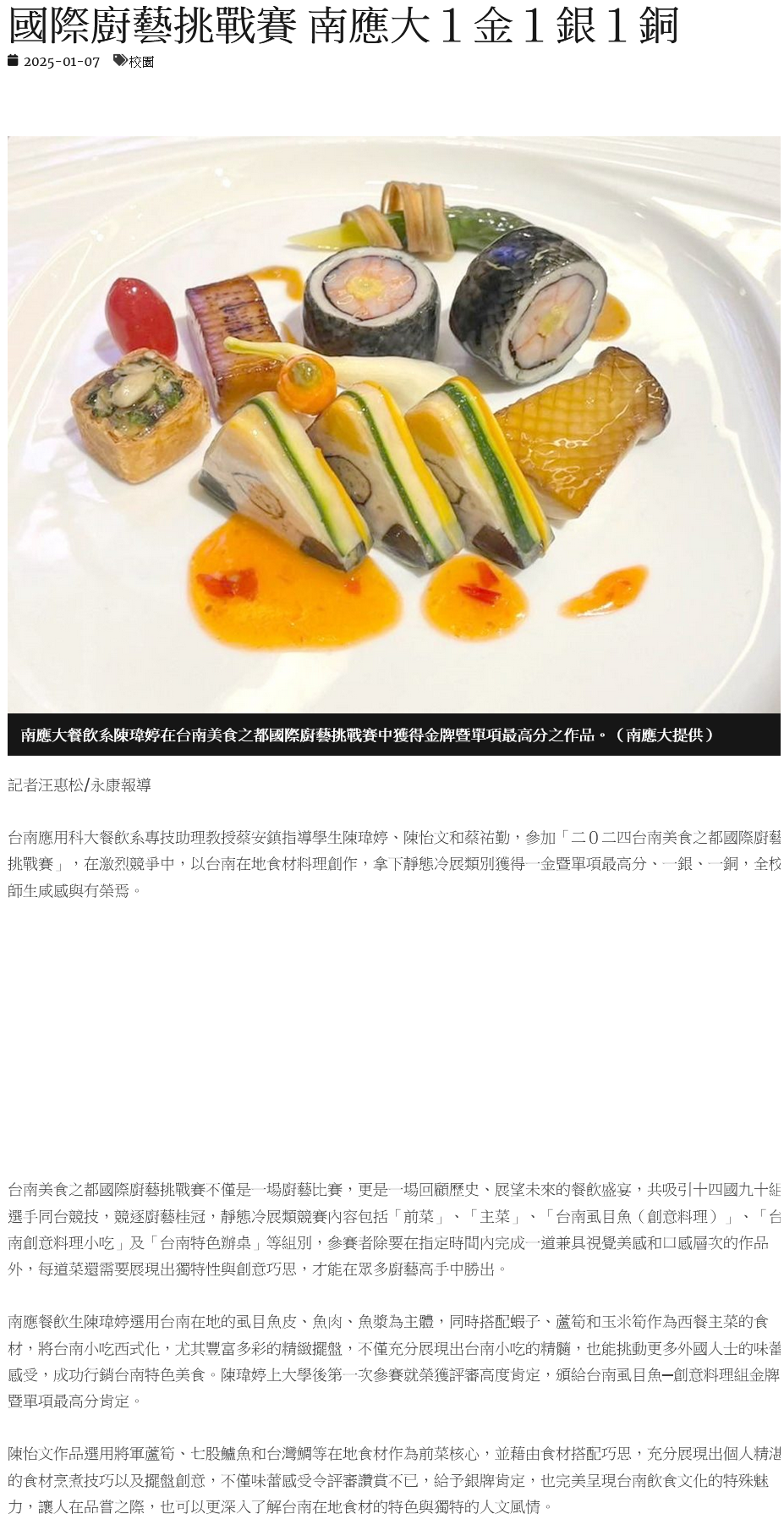 台南應用科大餐飲系專技助理教授蔡安鎮指導學生陳瑋婷、陳怡文和蔡祐勤,參加「二0二四台南美食之都國際廚藝挑戰賽」,在激烈競爭中,以台南在地食材料理創作,拿下靜態冷展類別獲得一金暨單項最高分、一銀、一銅,全校師生咸感與有榮焉。