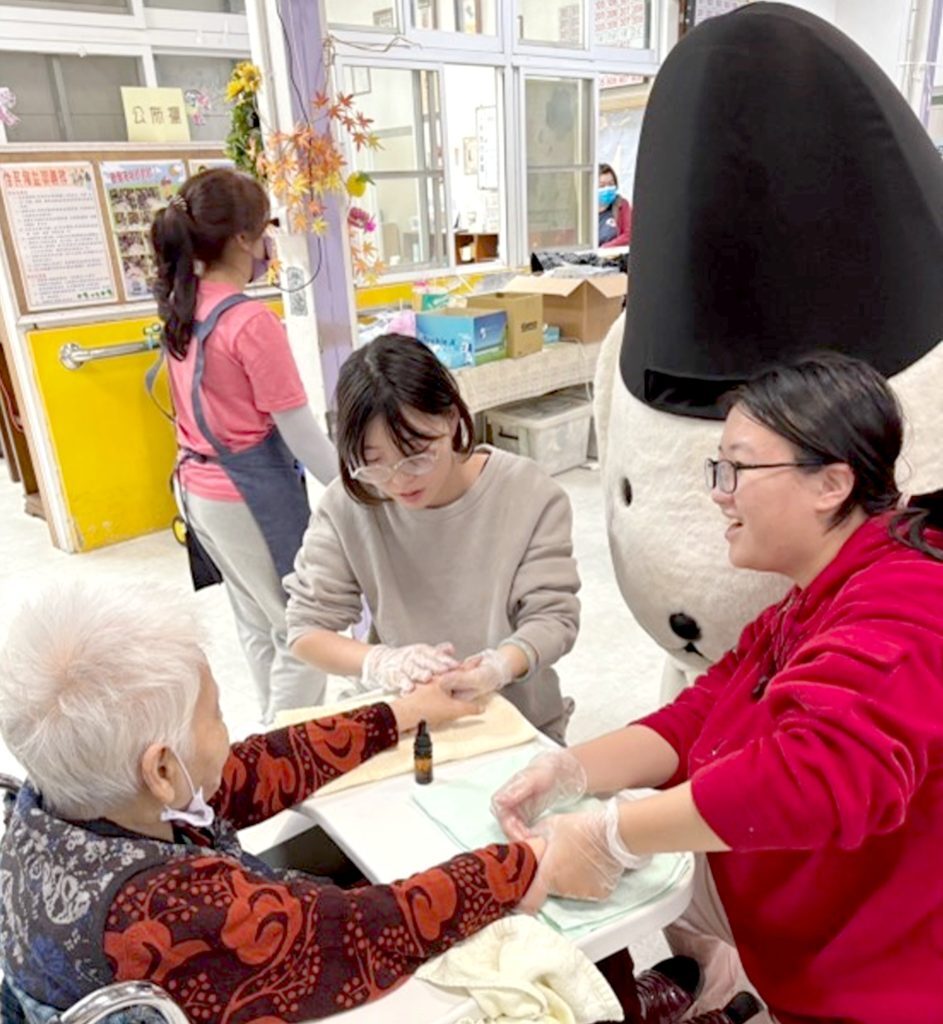 台南應用科大養生休閒管理系本學年度經絡按摩服務學習課程,結合專業技能與實地服務,由老師帶領學生前往屏東菩提樹長期照顧中心,為養護型長者提供經絡按摩服務,並邀請來自日本金澤石浦神社的和平大使Kima Chan參與,透過行動傳遞愛與和平理念。