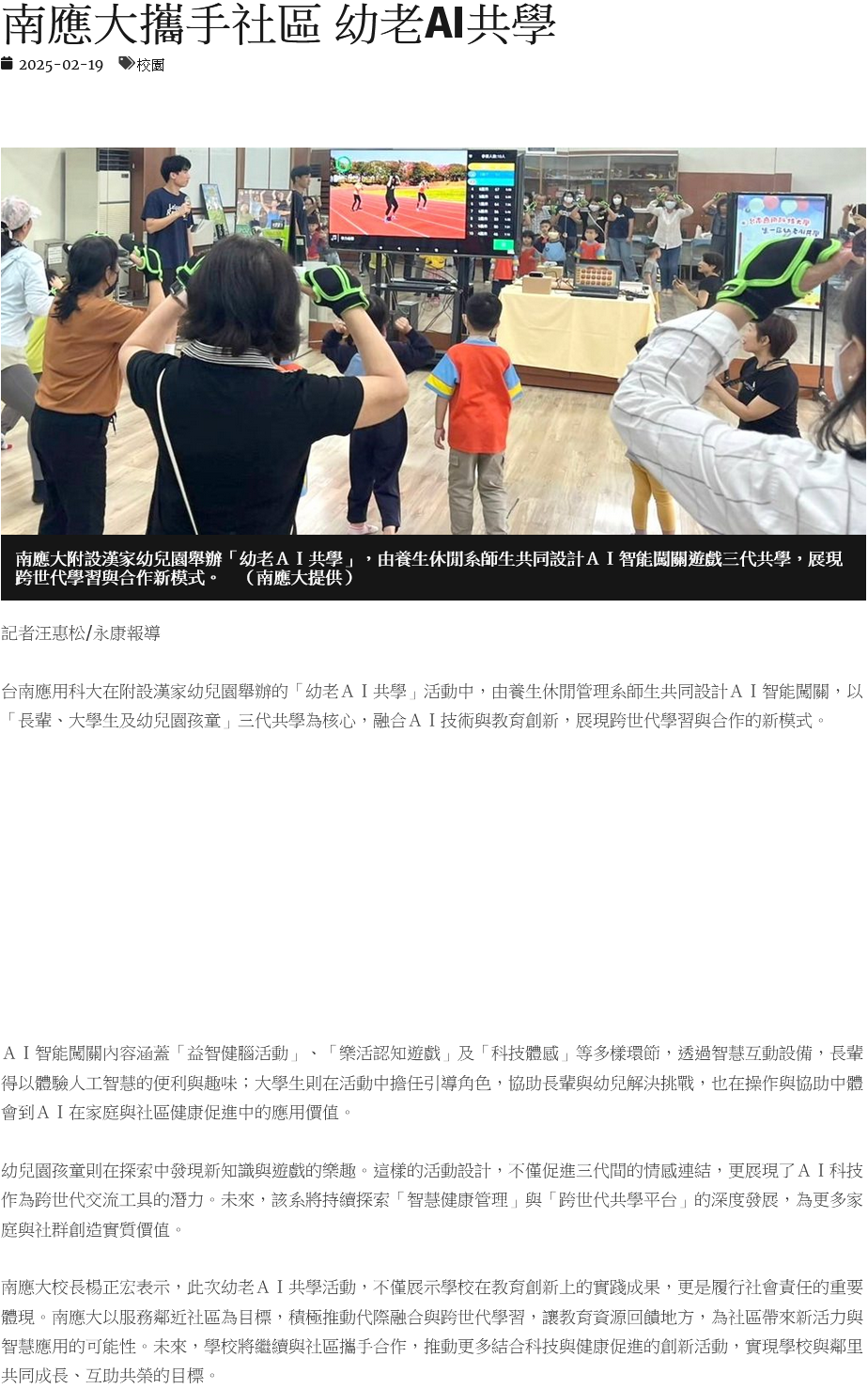 台南應用科大在附設漢家幼兒園舉辦的「幼老AI共學」活動中,由養生休閒管理系師生共同設計AI智能闖關,以「長輩、大學生及幼兒園孩童」三代共學為核心,融合AI技術與教育創新,展現跨世代學習與合作的新模式。