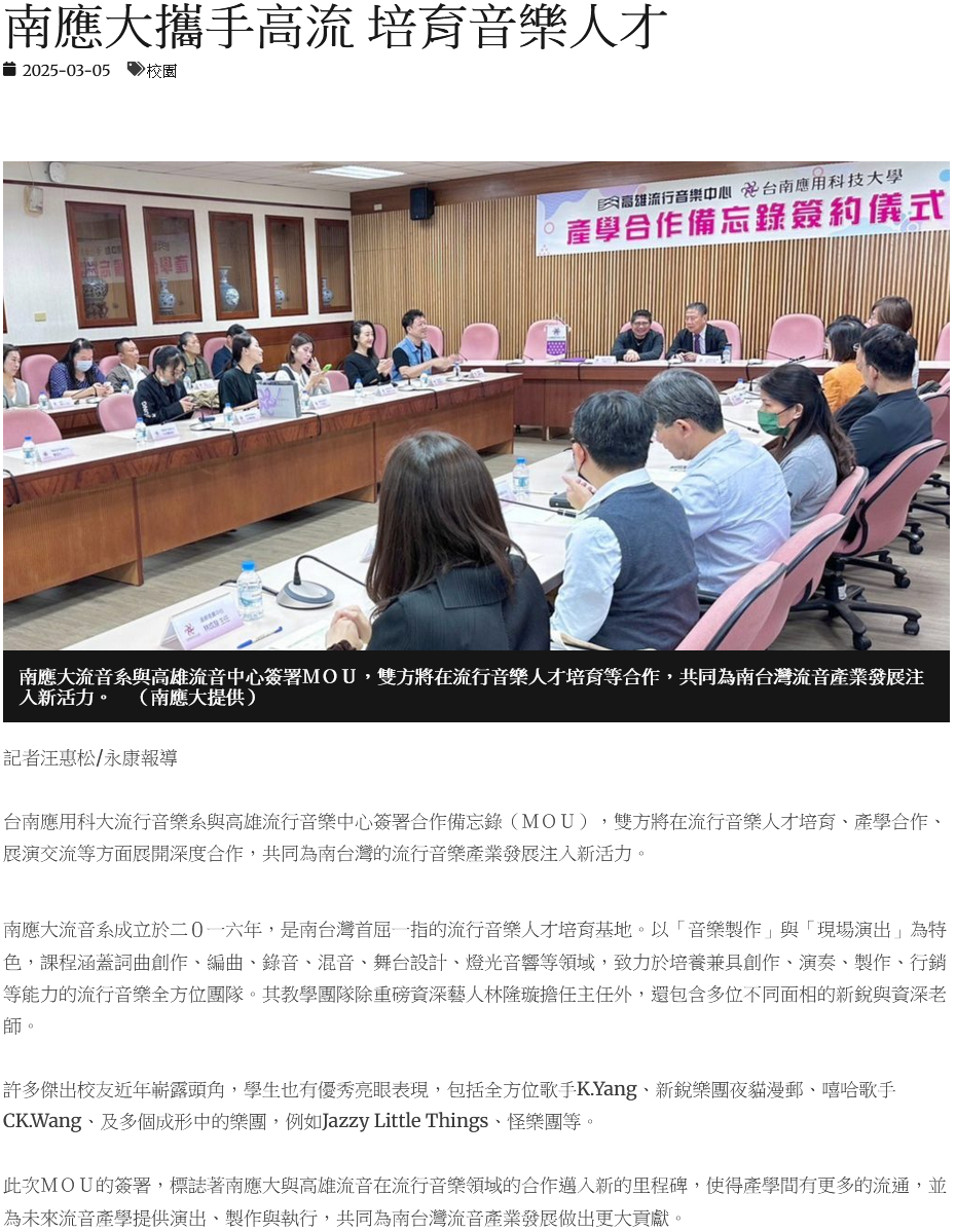 台南應用科大流行音樂系與高雄流行音樂中心簽署合作備忘錄(MOU),雙方將在流行音樂人才培育、產學合作、展演交流等方面展開深度合作,共同為南台灣的流行音樂產業發展注入新活力。
