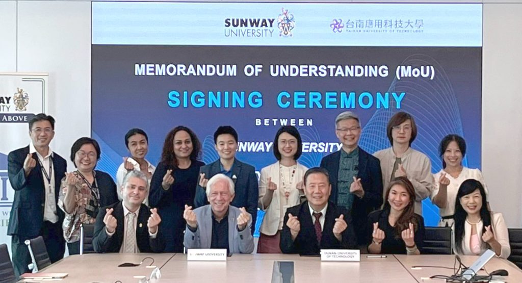 台南應用科大校長楊正宏帶領主秘沈孺淯、商品設計系主任陳中聖、流行音樂系主任林隆旋等,前往馬來西亞與雙威大學及雙威學院締結合作,共同簽訂學術MOU,聚焦雙方設計及藝術領域合作,深化雙方學術聯繫,為學生開創更寬廣的發展空間。