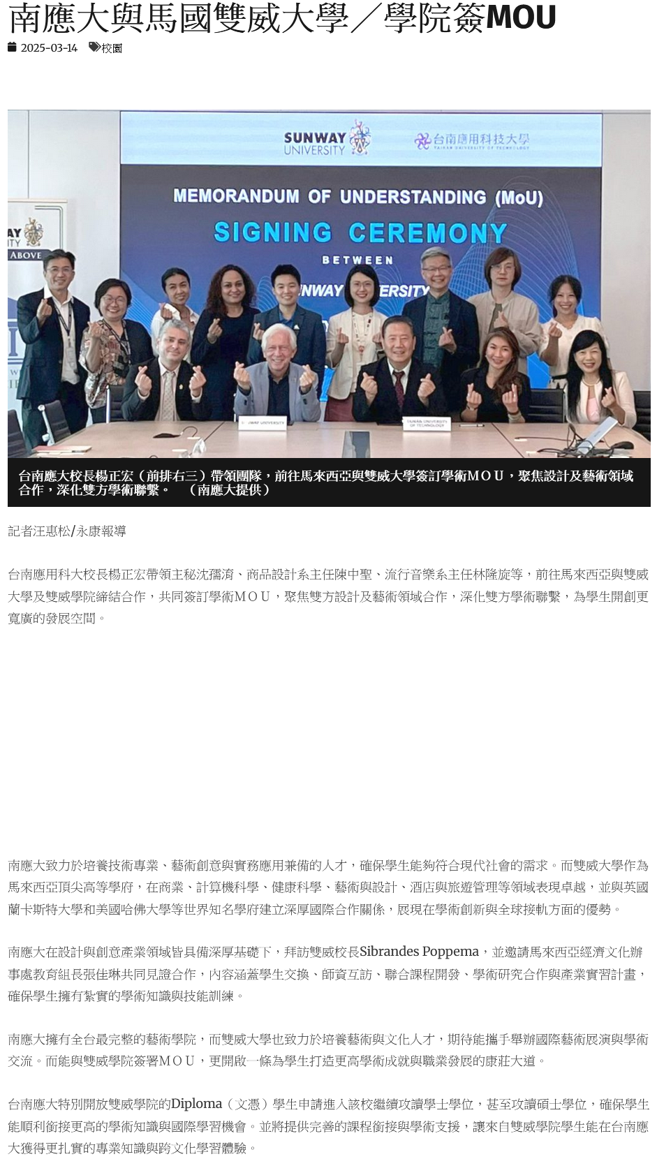 南應大在設計與創意產業領域皆具備深厚基礎下,拜訪雙威校長Sibrandes Poppema,並邀請馬來西亞經濟文化辦事處教育組長張佳琳共同見證合作,內容涵蓋學生交換、師資互訪、聯合課程開發、學術研究合作與產業實習計畫,確保學生擁有紮實的學術知識與技能訓練。