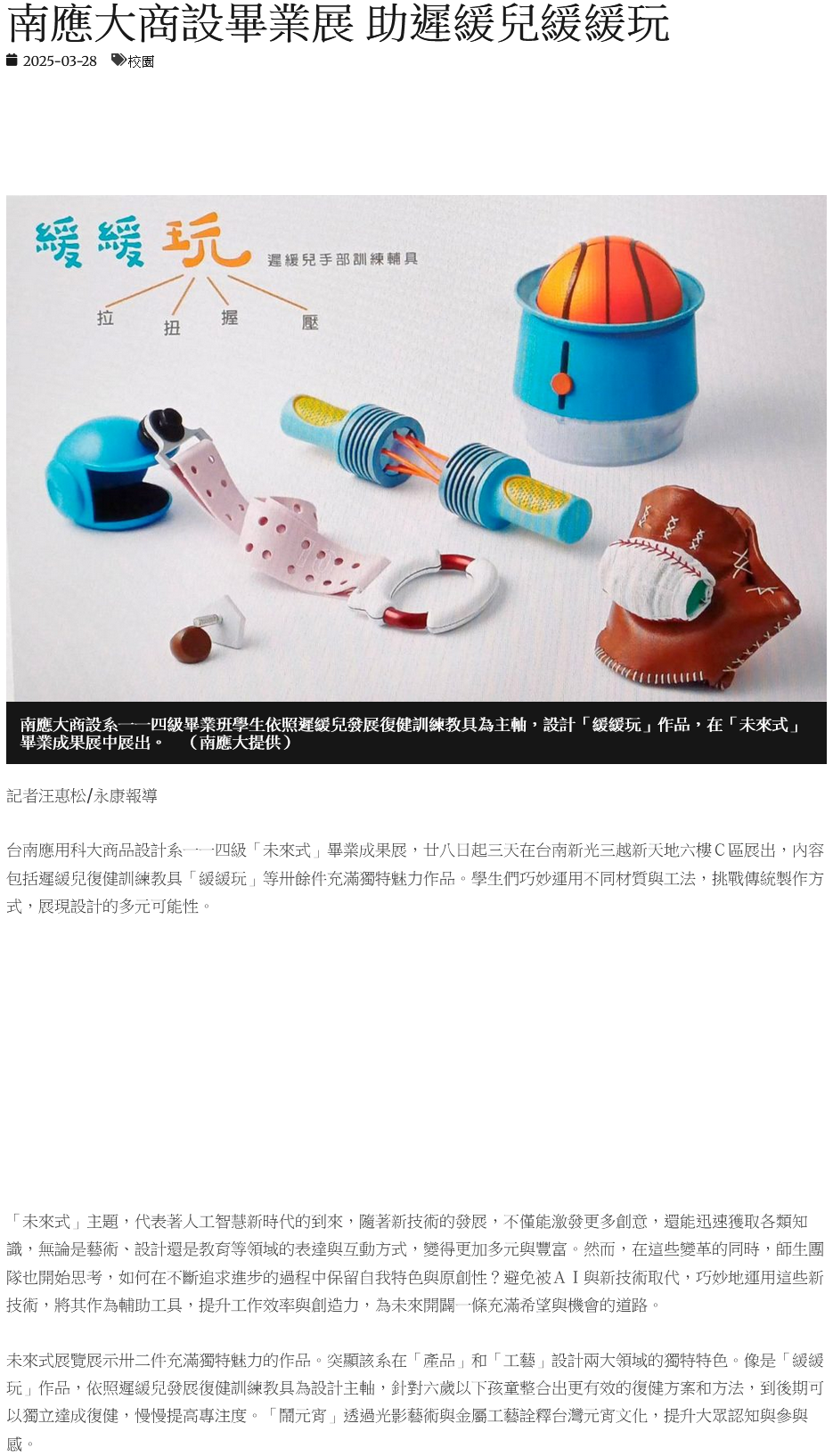 南應大商設畢業展 助遲緩兒緩緩玩 【記者汪惠松報導】https://www.cdns.com.tw/articles/1191402https://www.taiwantimes.com.tw/app-container/app-content/new/new-content-detail?blogId=blog-5b05247f-8c44-41e9-8453-f9bbd4eb7847¤tCategory=101(台灣時報同刊) 台南應用科大商品設計系一一四級「未來式」畢業成果展,廿八日起三天在台南新光三越新天地六樓C區展出,內容包括遲緩兒復健訓練教具「緩緩玩」等卅餘件充滿獨特魅力作品。學生們巧妙運用不同材質與工法,挑戰傳統製作方式,展現設計的多元可能性。 「未來式」主題,代表著人工智慧新時代的到來,隨著新技術的發展,不僅能激發更多創意,還能迅速獲取各類知識,無論是藝術、設計還是教育等領域的表達與互動方式,變得更加多元與豐富。然而,在這些變革的同時,師生團隊也開始思考,如何在不斷追求進步的過程中保留自我特色與原創性?避免被AI與新技術取代,巧妙地運用這些新技術,將其作為輔助工具,提升工作效率與創造力,為未來開闢一條充滿希望與機會的道路。 未來式展覽展示卅二件充滿獨特魅力的作品。突顯該系在「產品」和「工藝」設計兩大領域的獨特特色。像是「緩緩玩」作品,依照遲緩兒發展復健訓練教具為設計主軸,針對六歲以下孩童整合出更有效的復健方案和方法,到後期可以獨立達成復健,慢慢提高專注度。「鬧元宵」透過光影藝術與金屬工藝詮釋台灣元宵文化,提升大眾認知與參與感。