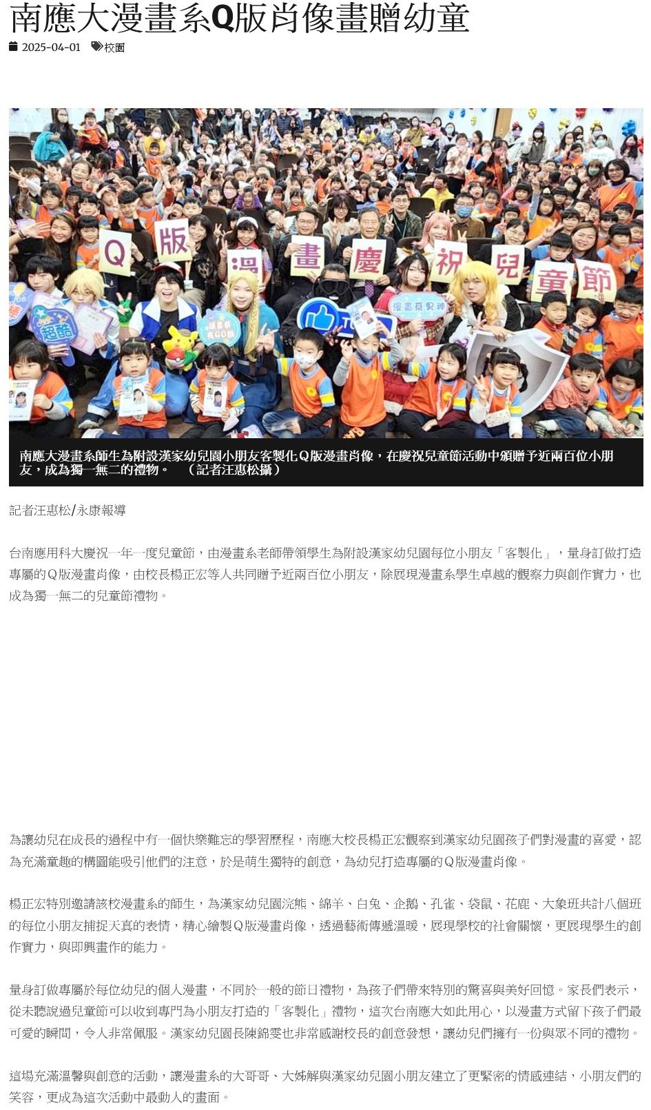 南應大漫畫系Q版肖像畫贈幼童 【記者汪惠松報導】https://www.cdns.com.tw/articles/1193687https://www.epochtimes.com/b5/25/4/1/n14472351.htm(大紀元同刊)https://news.ltn.com.tw/news/life/breakingnews/4998330(自由時報同刊) 台南應用科大慶祝一年一度兒童節,由漫畫系老師帶領學生為附設漢家幼兒園每位小朋友「客製化」,量身訂做打造專屬的Q版漫畫肖像,由校長楊正宏等人共同贈予近兩百位小朋友,除展現漫畫系學生卓越的觀察力與創作實力,也成為獨一無二的兒童節禮物。 為讓幼兒在成長的過程中有一個快樂難忘的學習歷程,南應大校長楊正宏觀察到漢家幼兒園孩子們對漫畫的喜愛,認為充滿童趣的構圖能吸引他們的注意,於是萌生獨特的創意,為幼兒打造專屬的Q版漫畫肖像。 楊正宏特別邀請該校漫畫系的師生,為漢家幼兒園浣熊、綿羊、白兔、企鵝、孔雀、袋鼠、花鹿、大象班共計八個班的每位小朋友捕捉天真的表情,精心繪製Q版漫畫肖像,透過藝術傳遞溫暖,展現學校的社會關懷,更展現學生的創作實力,與即興畫作的能力。 量身訂做專屬於每位幼兒的個人漫畫,不同於一般的節日禮物,為孩子們帶來特別的驚喜與美好回憶。家長們表示,從未聽說過兒童節可以收到專門為小朋友打造的「客製化」禮物,這次台南應大如此用心,以漫畫方式留下孩子們最可愛的瞬間,令人非常佩服。漢家幼兒園長陳錦雯也非常感謝校長的創意發想,讓幼兒們擁有一份與眾不同的禮物。 這場充滿溫馨與創意的活動,讓漫畫系的大哥哥、大姊解與漢家幼兒園小朋友建立了更緊密的情感連結,小朋友們的笑容,更成為這次活動中最動人的畫面。