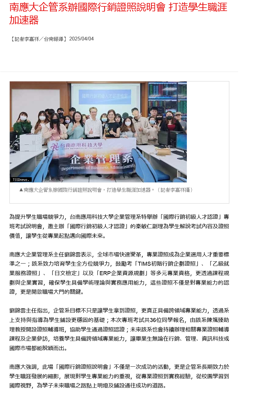 南應大企業管理系主任劉錦雲表示,全球市場快速變革,專業證照成為企業選用人才重要標準之一;該系致力培育學生全方位競爭力,鼓勵考「TIMS初階行銷企劃證照」、「乙級就業服務證照」、「日文檢定」以及「ERP企業資源規劃」等多元專業資格,更透過課程規劃與企業實習,確保學生具備學術理論與實務應用能力,這些證照不僅是對專業能力的認證,更是開啟職場大門的關鍵。