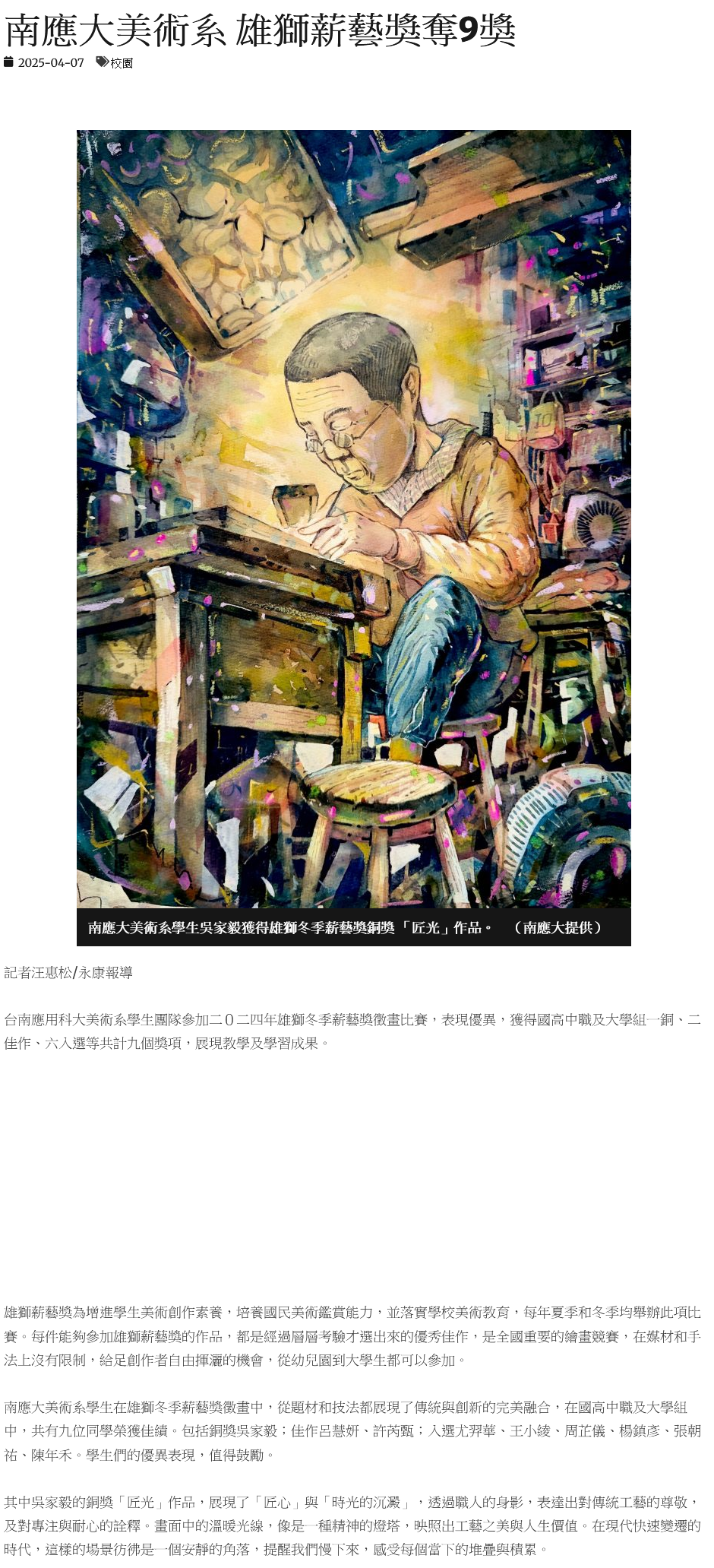 南應大美術系學生在雄獅冬季薪藝獎徵畫中,從題材和技法都展現了傳統與創新的完美融合,在國高中職及大學組中,共有九位同學榮獲佳績。包括銅獎吳家毅;佳作呂慧妍、許芮甄;入選尤羿華、王小綾、周芷儀、楊鎮彥、張朝祐、陳年禾。學生們的優異表現,值得鼓勵。
