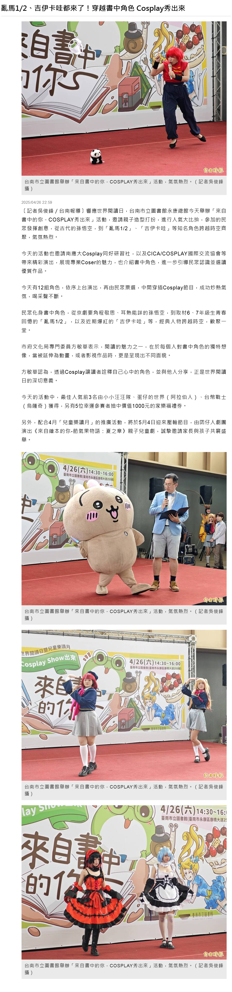 響應世界閱讀日,台南市立圖書館永康總館今天舉辦「來自書中的你-COSPLAY秀出來」活動,邀請親子造型打扮,進行人氣大比拚,參加的民眾發揮創意,從古代的孫悟空,到「亂馬1/2」、「吉伊卡哇」等知名角色跨越時空齊聚,氣氛熱烈。